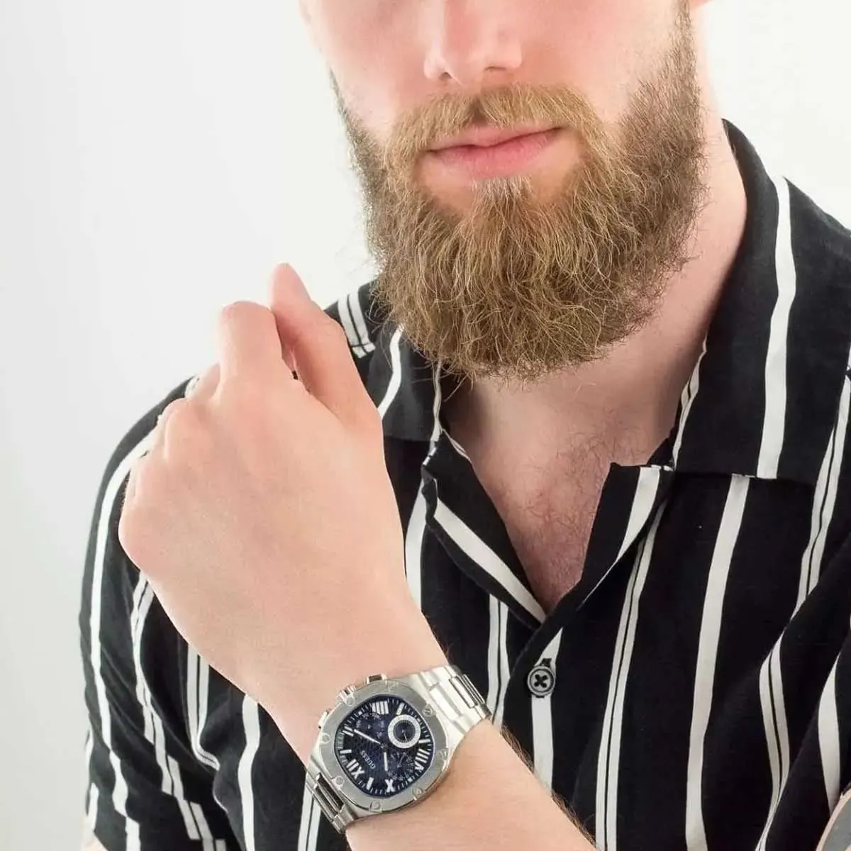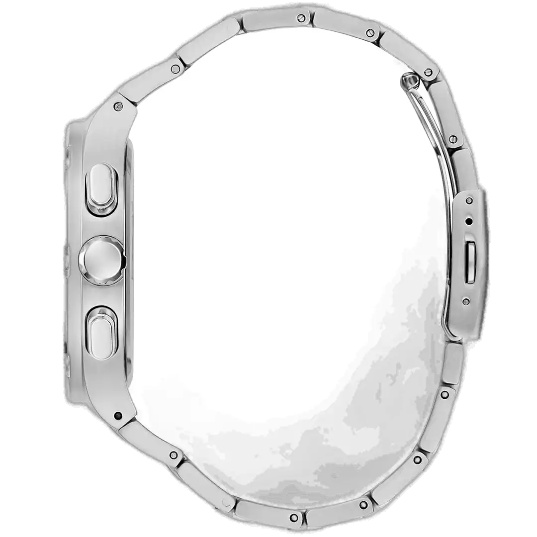 The Guess Headline GW0572G1 comes in the signature rounded 42mm square case that defines the Headline collection, a unique design that skillfully blends modernity with classic lines. The case is meticulously crafted from silver-tone stainless steel (Silver-Tone Stainless Steel), ensuring superior durability and a consistent, brilliant shine. The case is perfectly complemented by a high-quality silver-tone metal strap also made from stainless steel, featuring a mix of polished and brushed links that add a multi-dimensional allure. This metal strap provides enduring stability and comfort, secured by a robust deployment clasp for reliable wear.