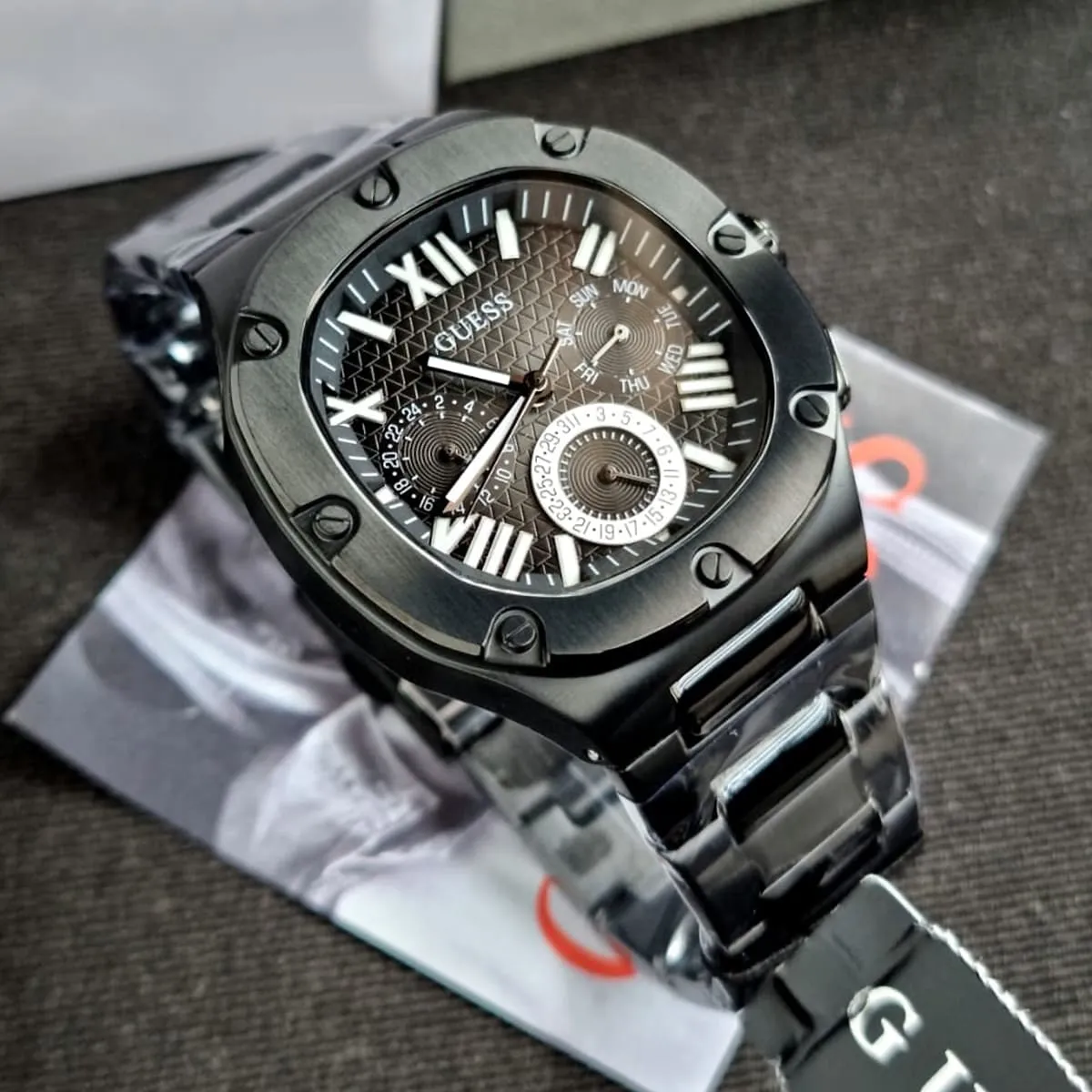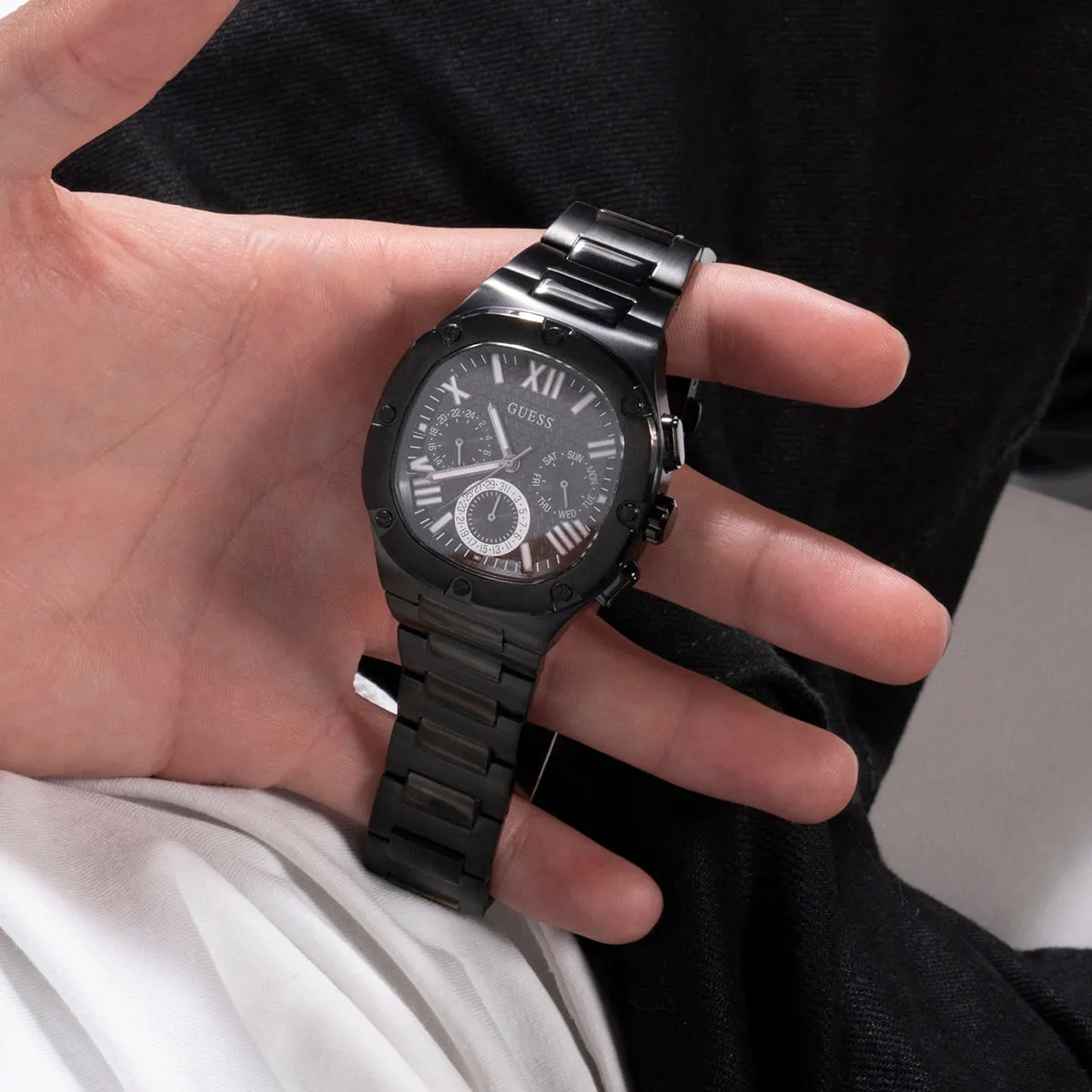 The Guess Headline Black watch serves as the ultimate accessory for the modern man. It pairs stunningly with smart-casual wear, semi-formal attire, and any style leaning towards darker color palettes or those needing a bold focal point. It projects a strong, confident personality, representing an investment in a contemporary piece that retains its striking allure over time.