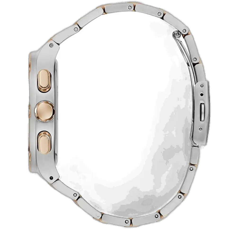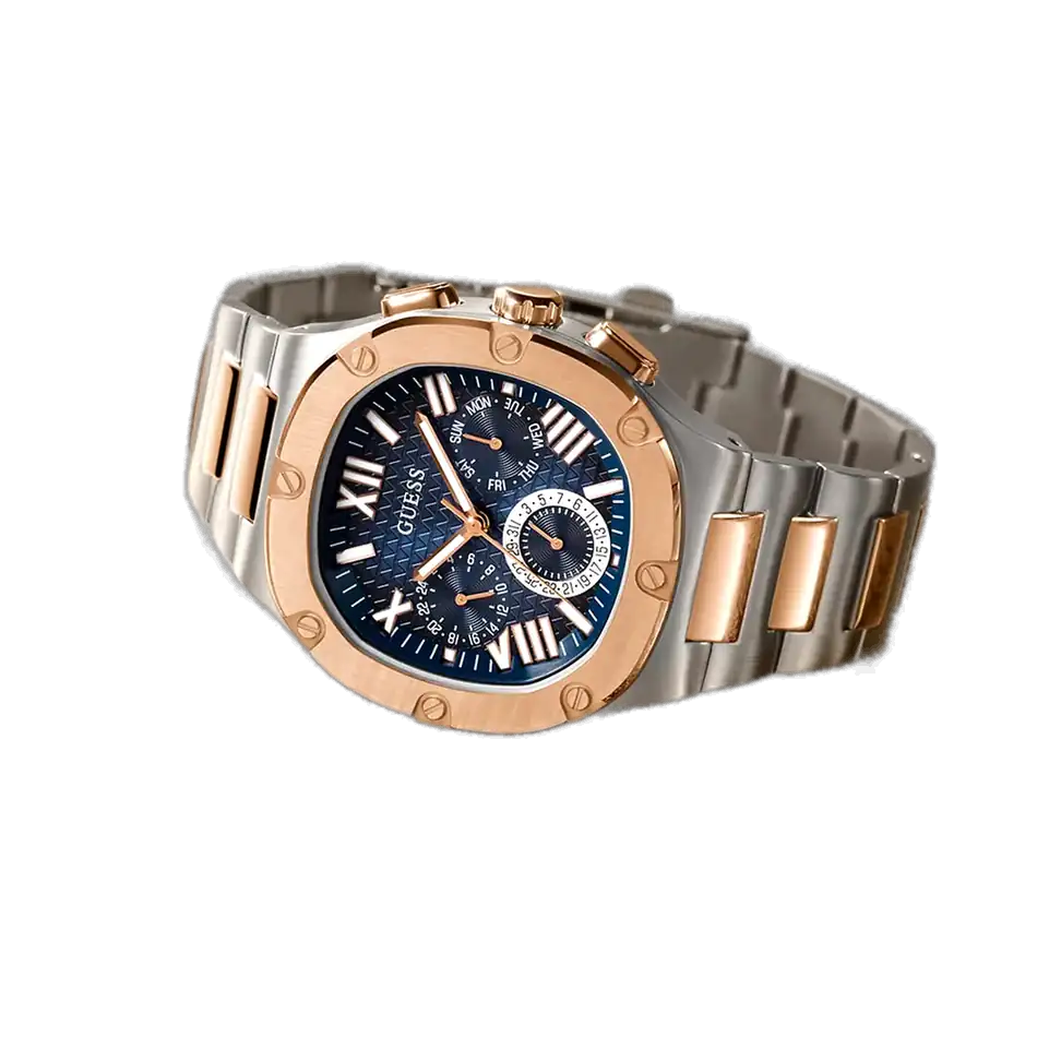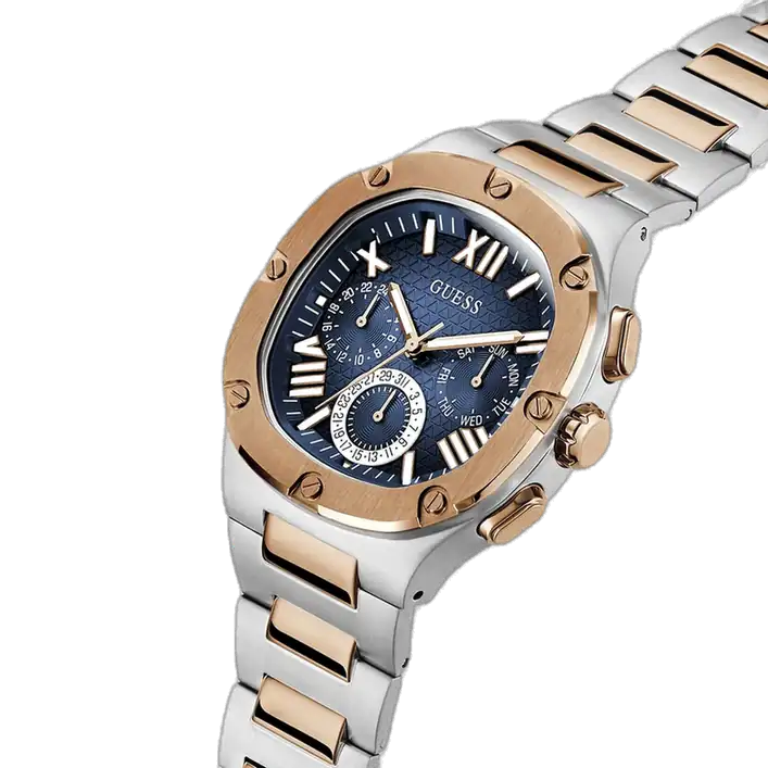The Guess Headline GW0572G4 is a remarkably versatile accessory for the discerning gentleman. Its two-tone aesthetic makes it an excellent match for outfits featuring blue, silver, or rose gold accents. Pair it with a navy or gray suit to add depth and professionalism, or with a smart-casual ensemble (such as dark denim and a polo shirt or a crisp white button-down) to reflect a refined and fashion-forward taste. It strikes a perfect balance between classic charm and contemporary flair, making it a truly adaptable piece.