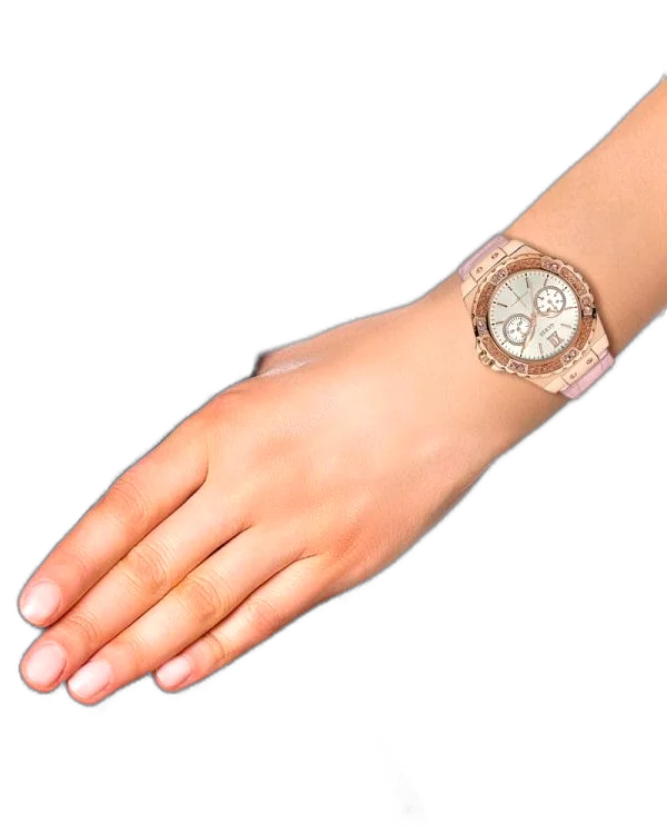 The focus remains firmly on the elegant, pristine white dial. The white background acts as the perfect canvas, ensuring the silver-tone hands and markers are instantly legible—a practical necessity fused with chic design. Many Limelight models, including this one, feature exquisite crystal accents subtly placed on the dial, replacing or accompanying the hour markers. This signature touch of Guess sparkle turns the act of checking the time into a luxurious moment.