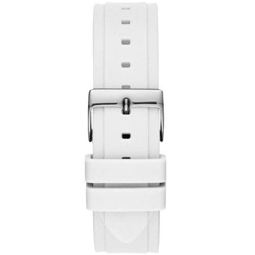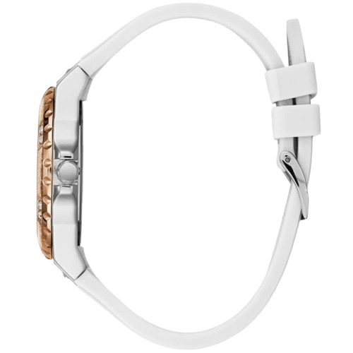 Shine brighter every day with the Guess Limelight W1053L2. This women’s watch combines a pure white dial and white silicone strap, complemented by a rose gold crystal-set bezel for a fresh, glamorous look. Perfect for those who seek elegance and comfort in every moment.