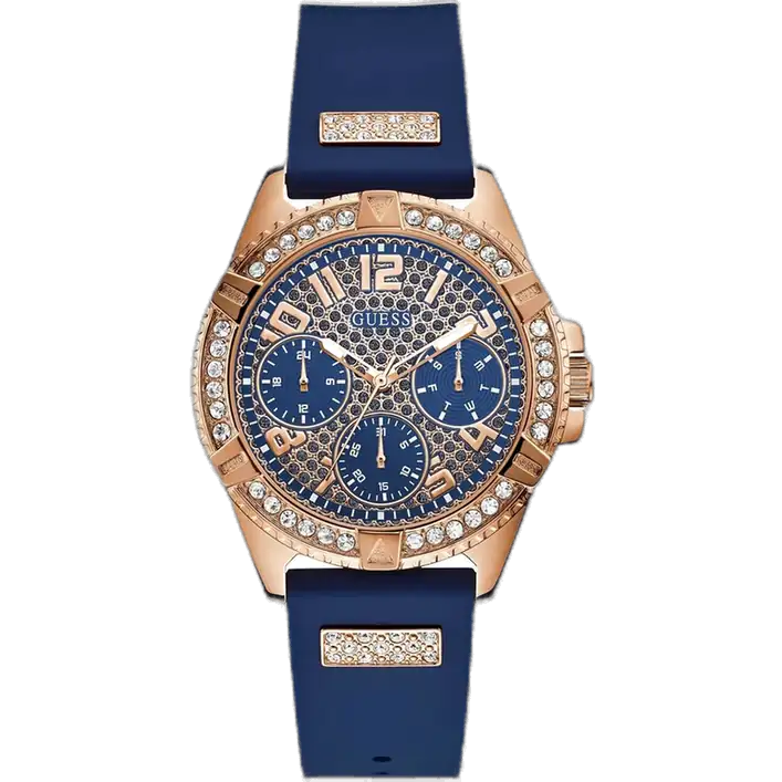 Make a vivid statement with the original Guess W1160L3. This Lady Frontier model features a striking Rose Gold-Tone case, a brilliant Blue Dial with crystal accents, and a highly comfortable, matching Blue Rubber Strap. Multi-function movement, 40mm case, and 50M water resistance.