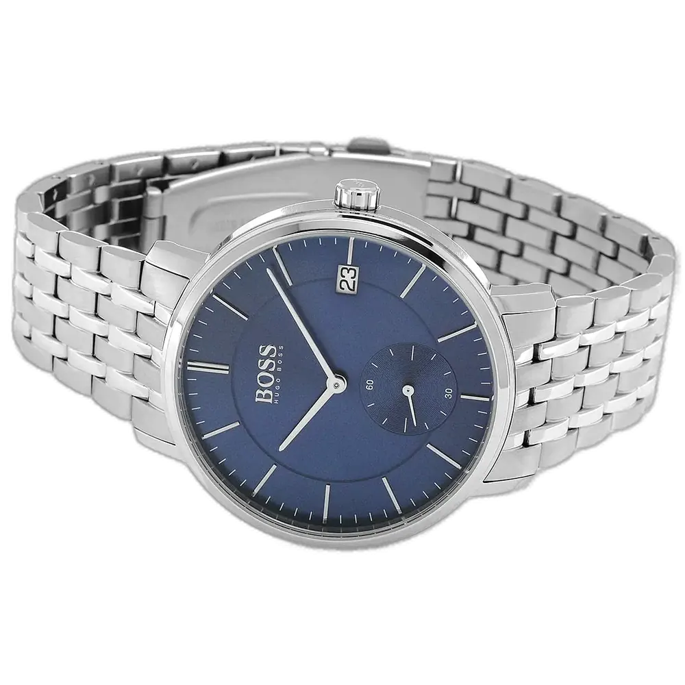 Discover the essence of refined craftsmanship with the Hugo Boss Corporal 1513642 watch, crafted for the modern man who values elegance and reliability. Renowned for its German engineering, Hugo Boss delivers a seamless blend of luxury and functionality in this standout piece from the Corporal collection. The watch features a robust stainless steel case housing a striking blue sunburst dial, accented with luminous silver hands and markers for enhanced readability. The minimalist design includes a date window at 3 o’clock, offering practical elegance. Paired with a polished silver stainless steel bracelet, it provides a versatile, sophisticated look suitable for both formal and casual occasions. Powered by a reliable quartz movement, it ensures precise timekeeping for your dynamic lifestyle.