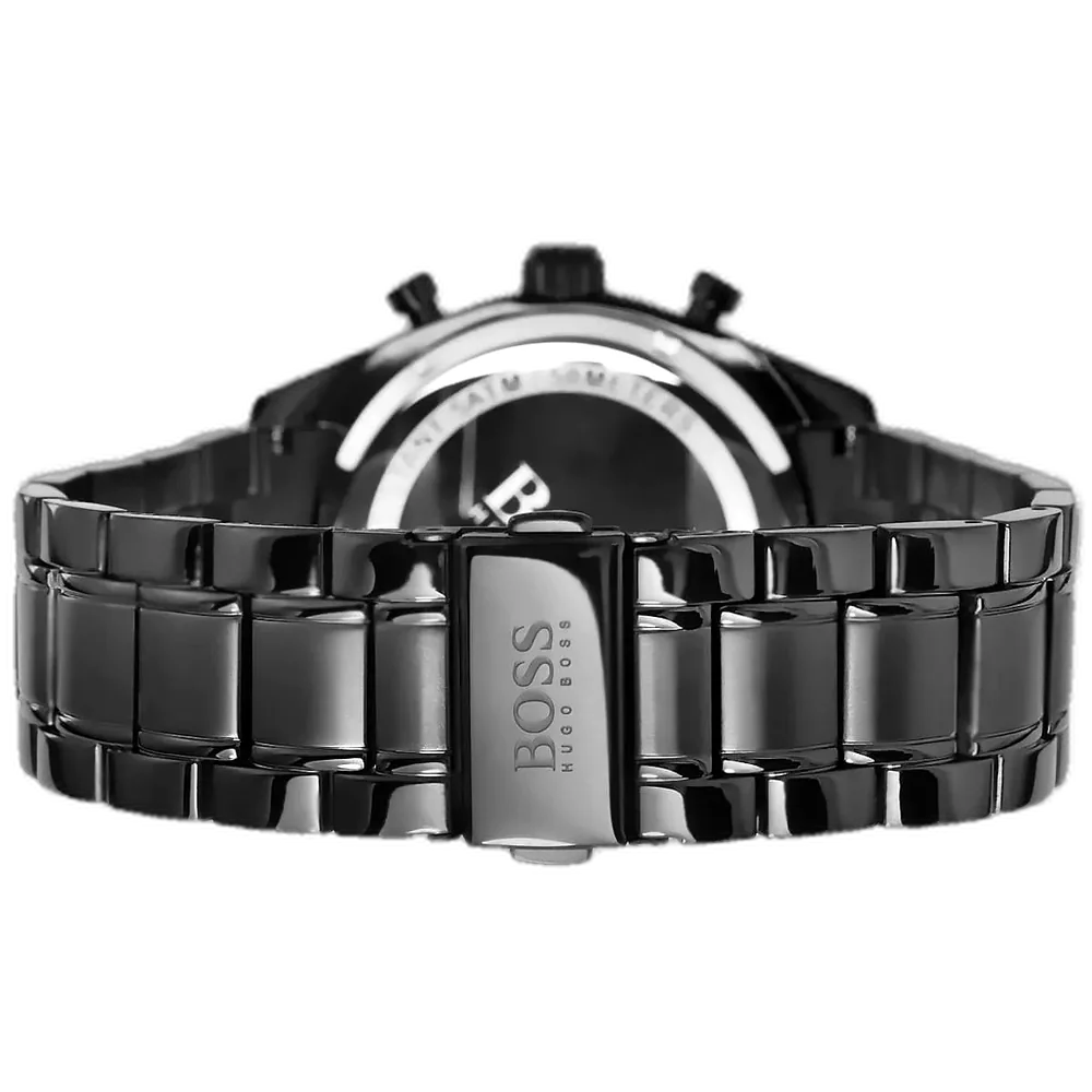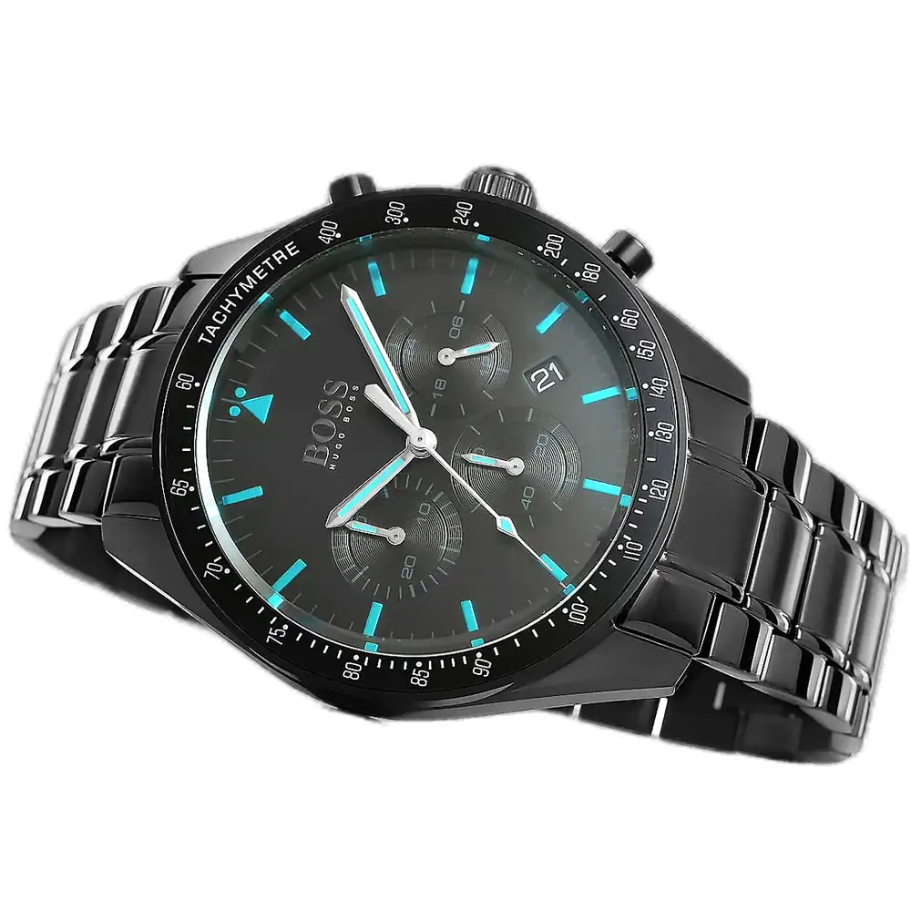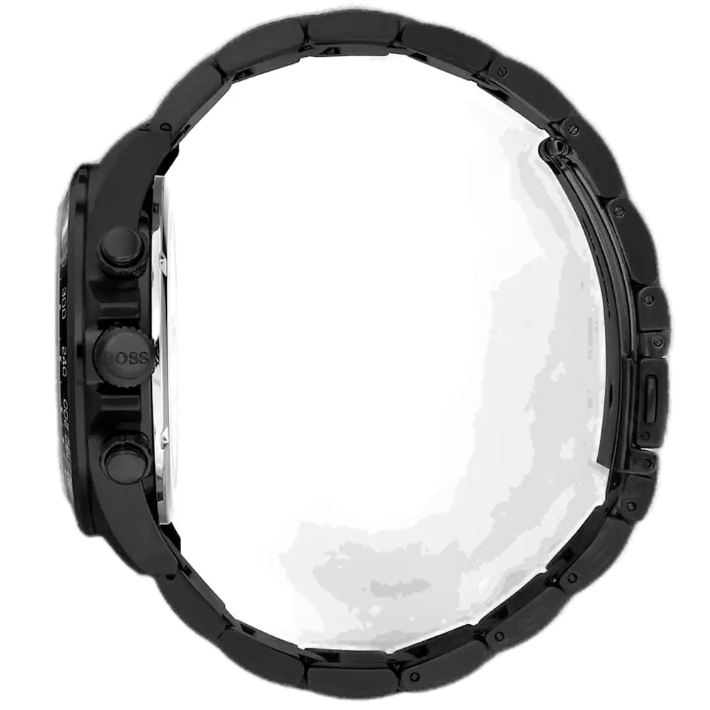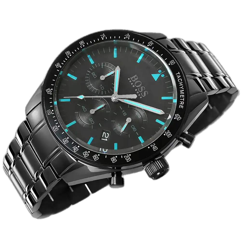 Elevate your victorious style with the original Hugo Boss men’s chronograph watch, model (Trophy) 1513675. This bold timepiece features a striking black dial paired with a sleek black PVD-coated stainless steel bracelet, combining modern luxury with precise functionality.
