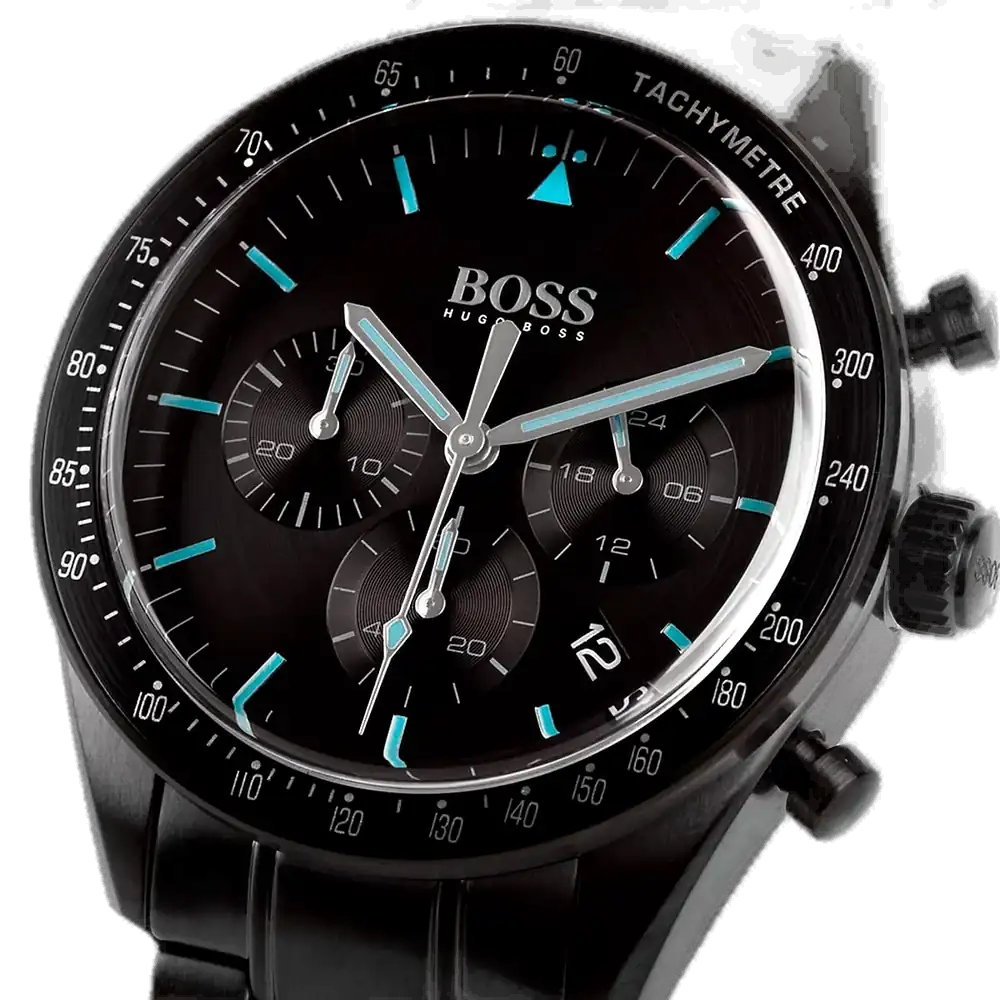 Experience the pinnacle of achievement with the Hugo Boss Trophy 1513675 chronograph watch, designed for the modern man who celebrates success with style and precision. As a symbol of German excellence, Hugo Boss is renowned for its fusion of luxury and innovation. This watch from the Trophy collection boasts a robust black PVD-coated stainless steel case and bracelet, offering a durable, matte finish that exudes confidence. The black sunray dial is illuminated with luminous hands and markers for superior visibility, complemented by three sub-dials for chronograph timing, a tachymeter bezel for added utility, and a date window at 4:30. Powered by a reliable Japanese quartz movement, it ensures accuracy in every triumph.