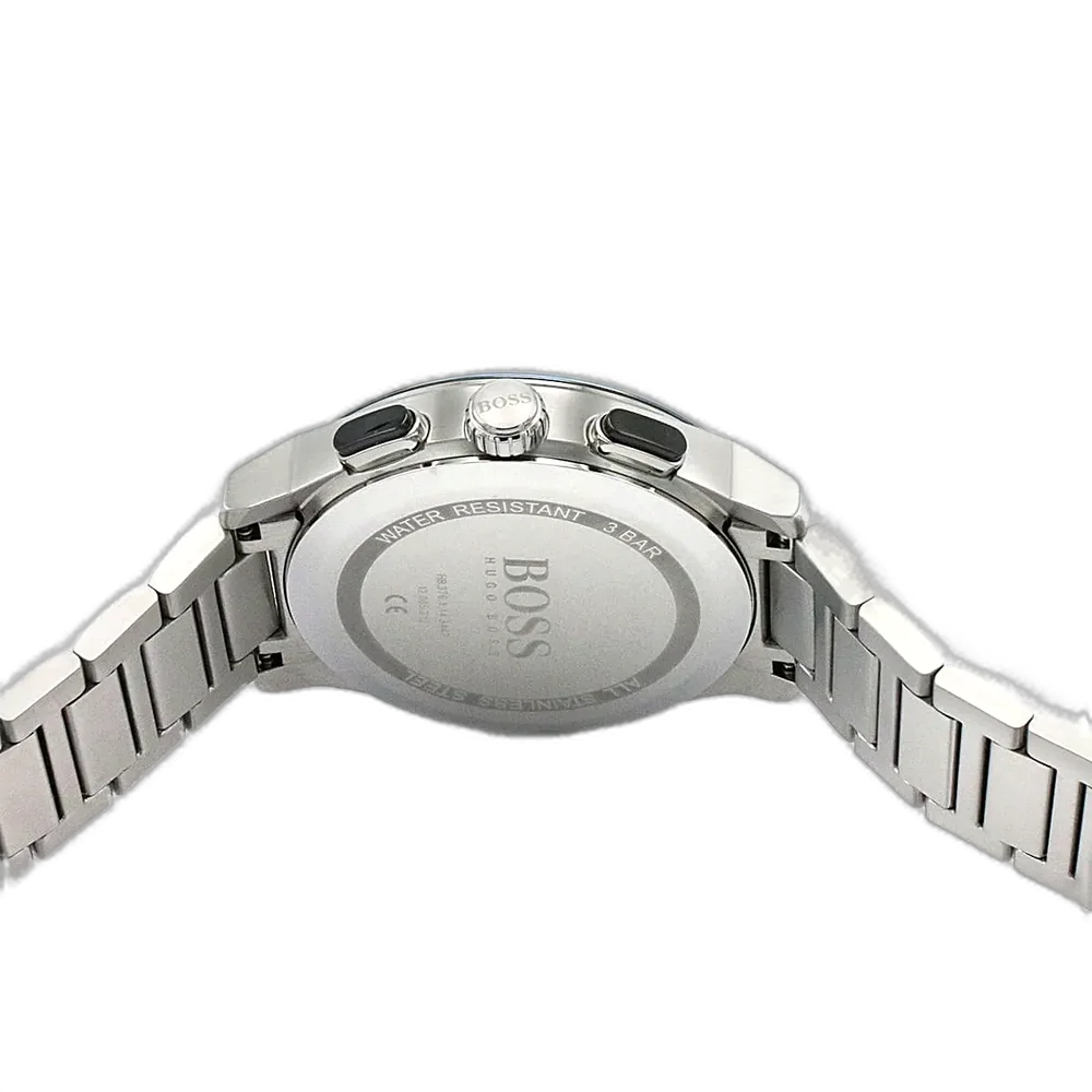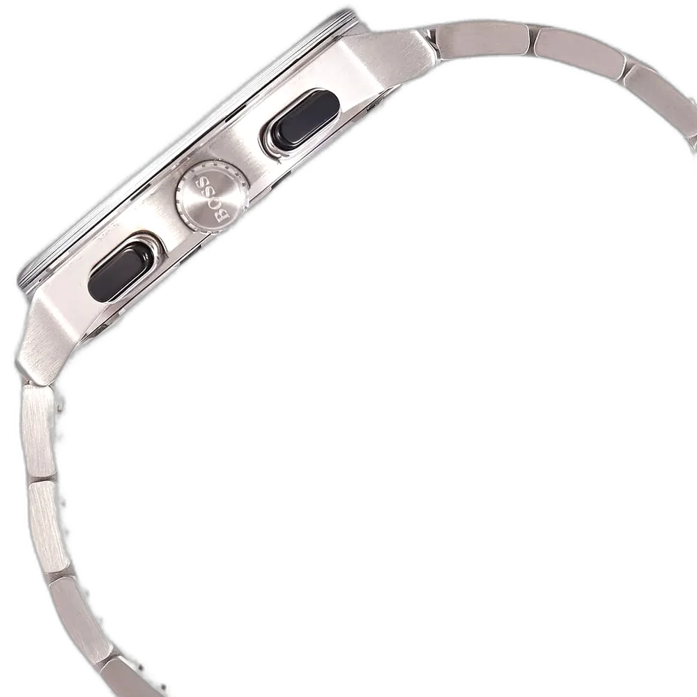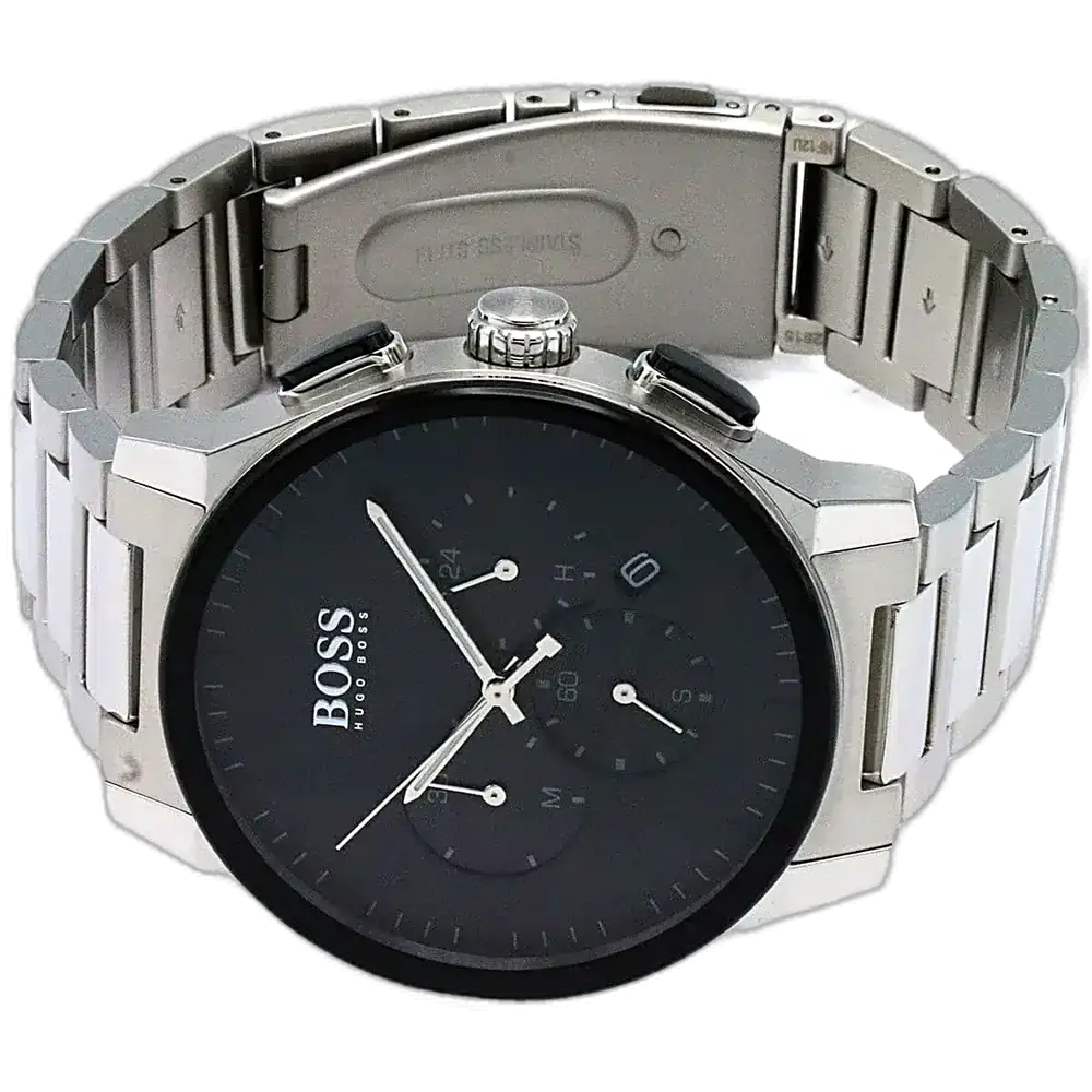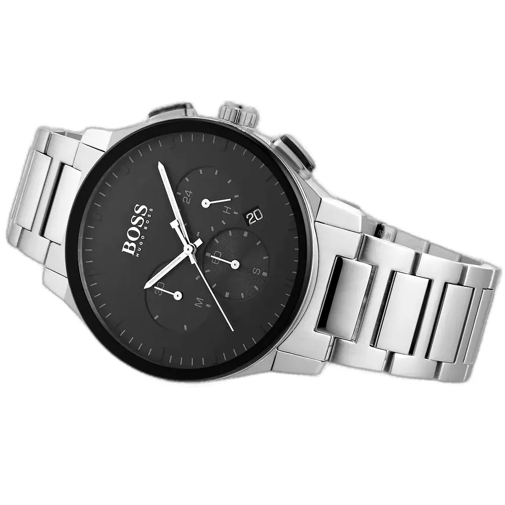 Elevate your modern style with the original Hugo Boss men’s chronograph watch, model (Peak) 1513762. This striking timepiece features a bold black dial paired with a polished silver stainless steel bracelet, blending contemporary luxury with precise functionality.