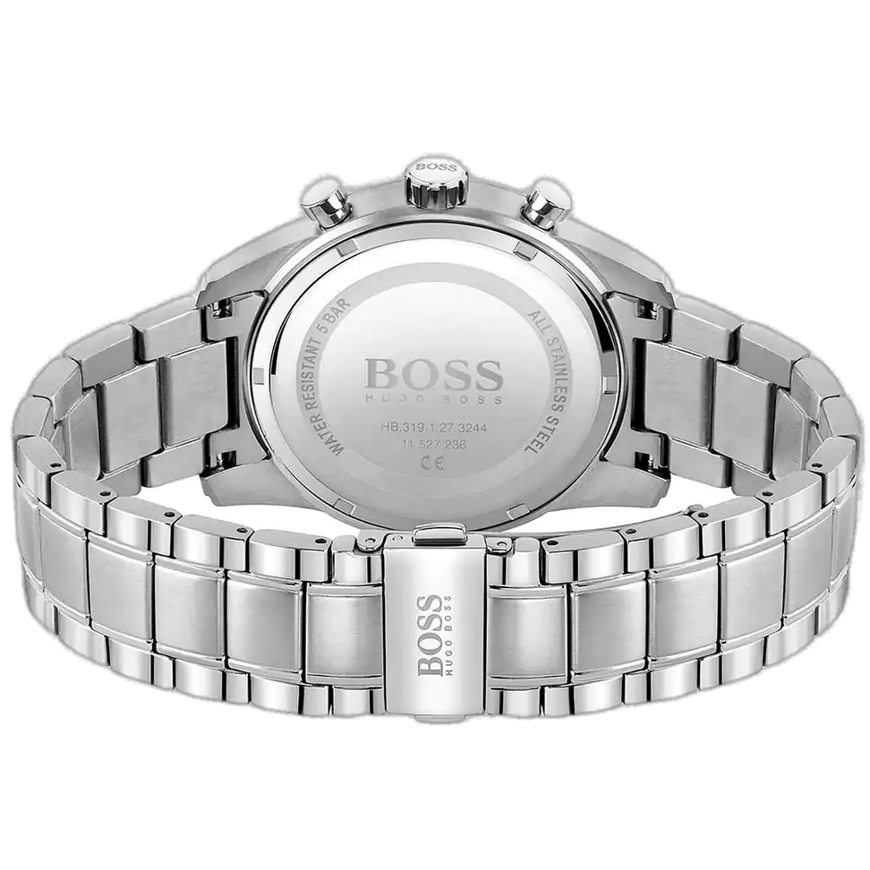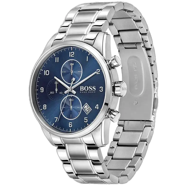 Soar to new heights of style with the original Hugo Boss men’s chronograph watch, model (Skymaster) 1513784. This sophisticated timepiece features a vibrant blue dial paired with a polished silver stainless steel bracelet, blending modern luxury with precise functionality.