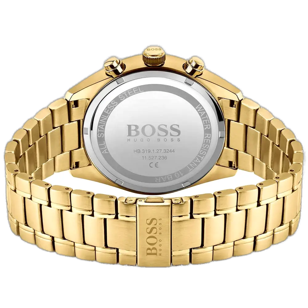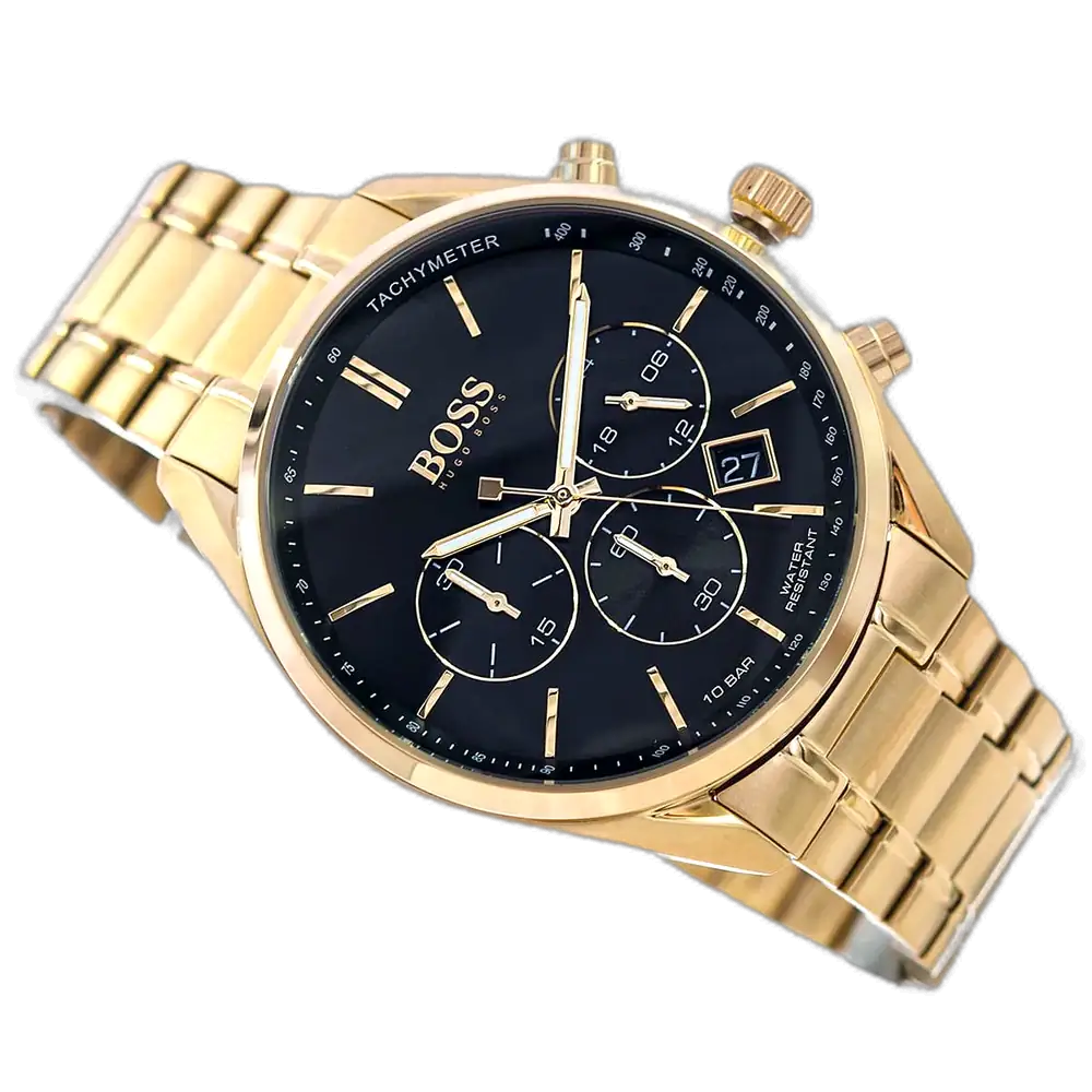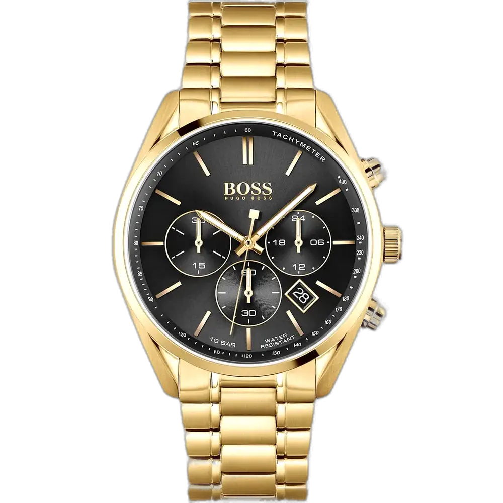 Elevate your winning style with the original Hugo Boss men’s chronograph watch, model (Champion) 1513848. This luxurious timepiece features a bold black dial paired with a refined gold-tone stainless steel bracelet, blending modern elegance with high-performance functionality.