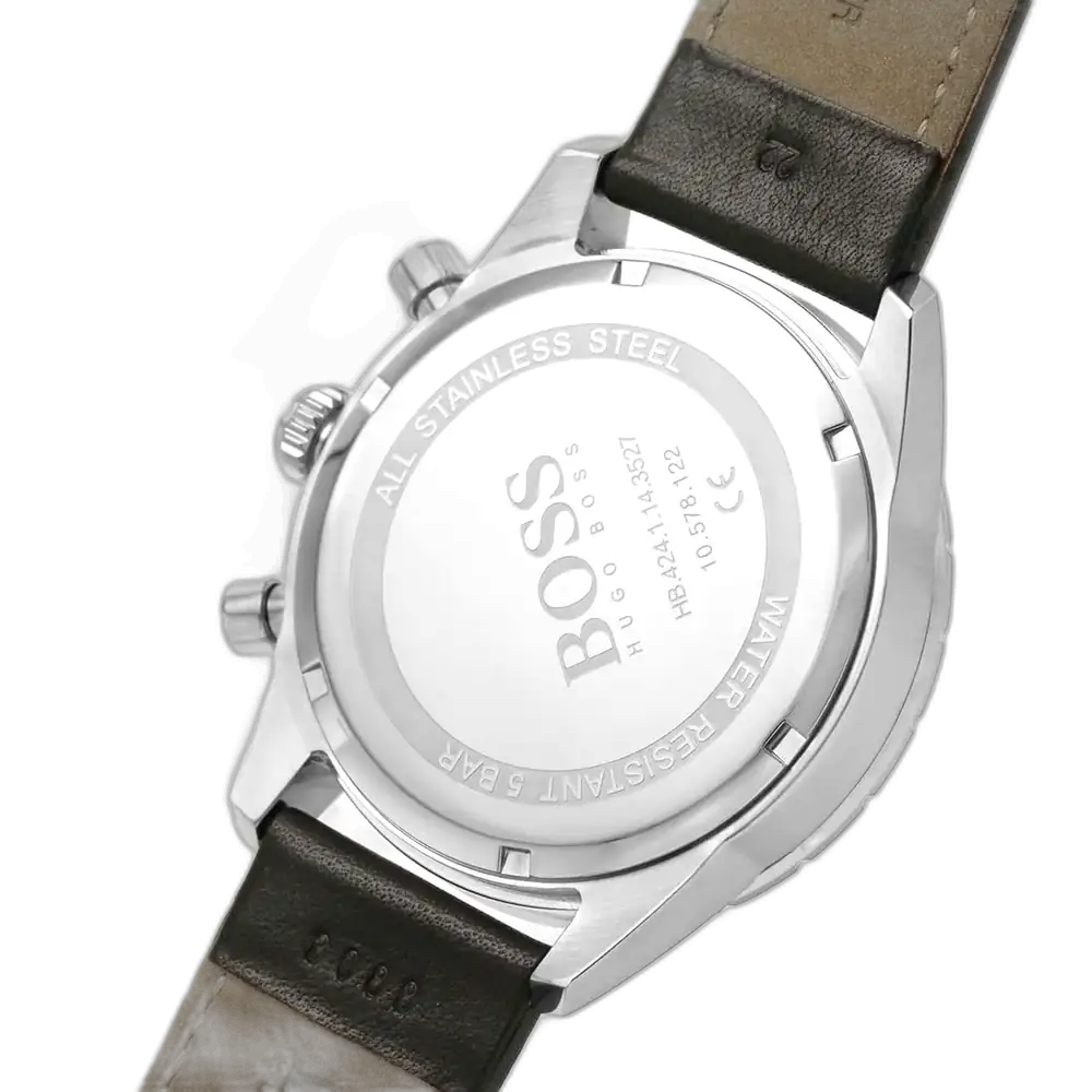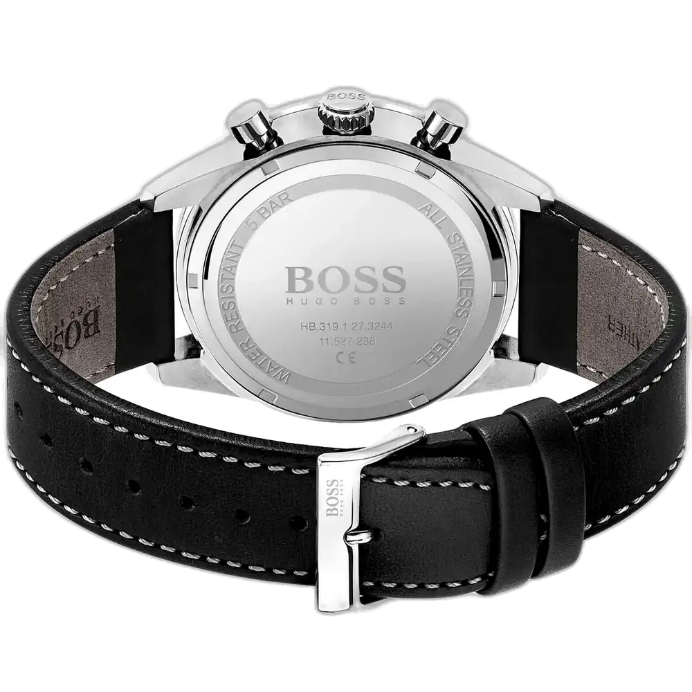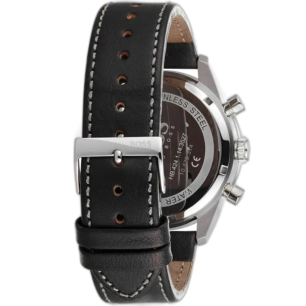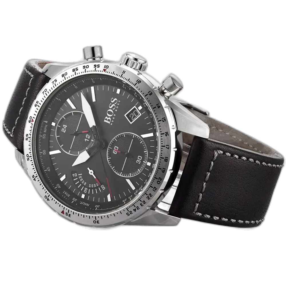 Soar to new heights of style with the original Hugo Boss men’s chronograph watch, model (Pilot Edition Chrono) 1513853. This sophisticated timepiece features a bold black dial paired with a premium black leather strap, blending aviation-inspired luxury with precise functionality.
