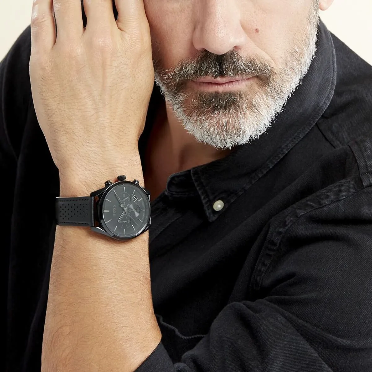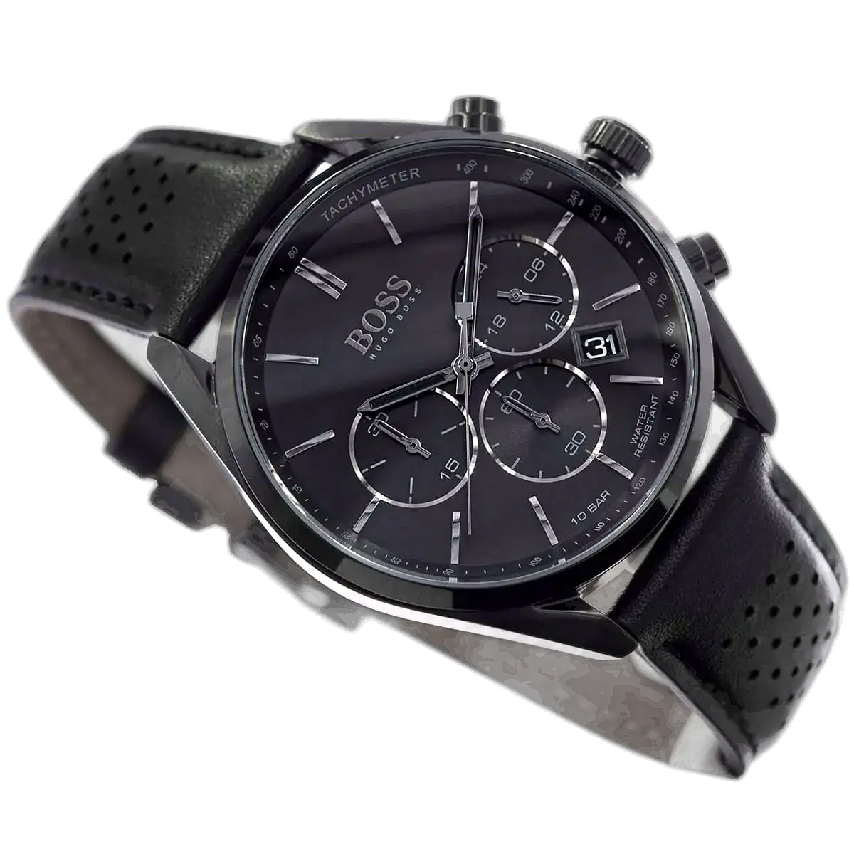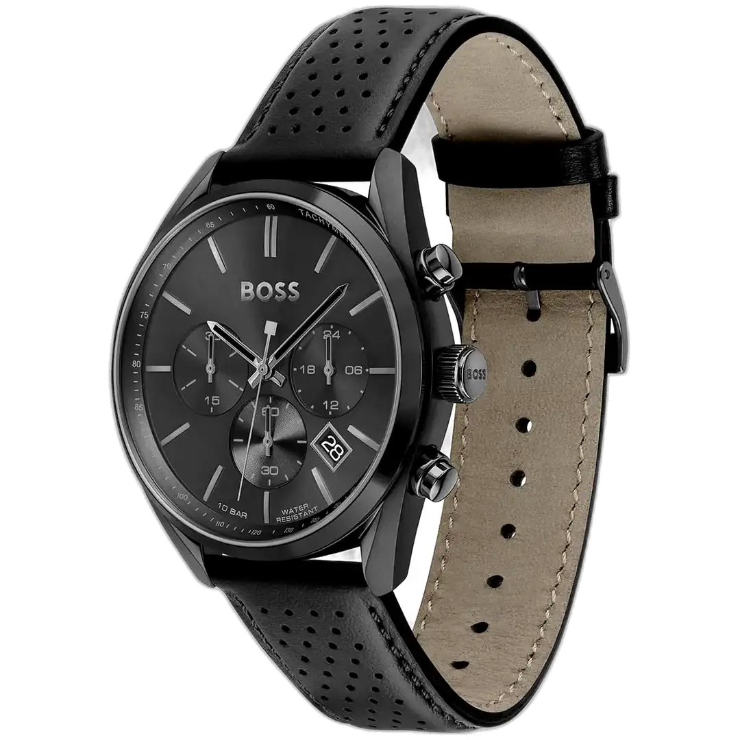 Conquer style with the original Hugo Boss men’s chronograph watch, model (Champion) 1513880. This sophisticated timepiece features a sleek black dial paired with a premium black leather strap, blending bold luxury with precise functionality.