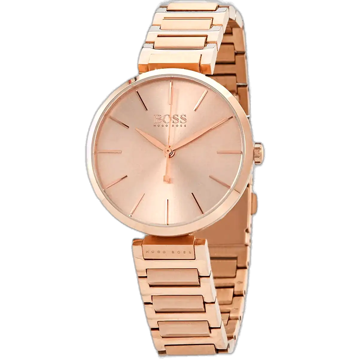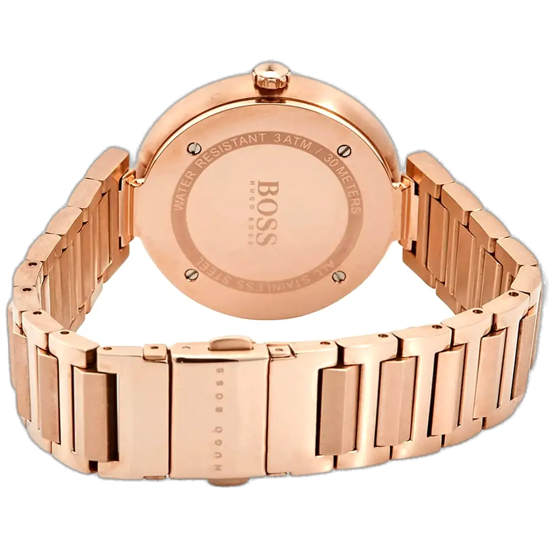 The Hugo Boss Allusion 1502418 (Manufacturer Ref. HB.316.3.34.3035) stands out in the Allusion collection with its full rose gold (copper) plating. Designed in a sleek 36mm stainless steel case, this watch showcases a brilliant copper sunray dial that perfectly matches the rose gold-tone case and bracelet. The minimalist design prioritizes clean, uncluttered timekeeping, making the metallic luster the central focus.