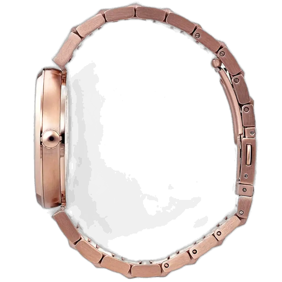This stunning Hugo Boss Allusion Copper watch is powered by a reliable quartz movement, ensuring accurate time. The monochromatic application of the rose gold tone across the entire watch—from the stick markers and hands to the integrated copper-tone stainless steel bracelet—creates a fluid, seamless look of pure luxury. The bracelet is secured with a dependable deployment clasp.