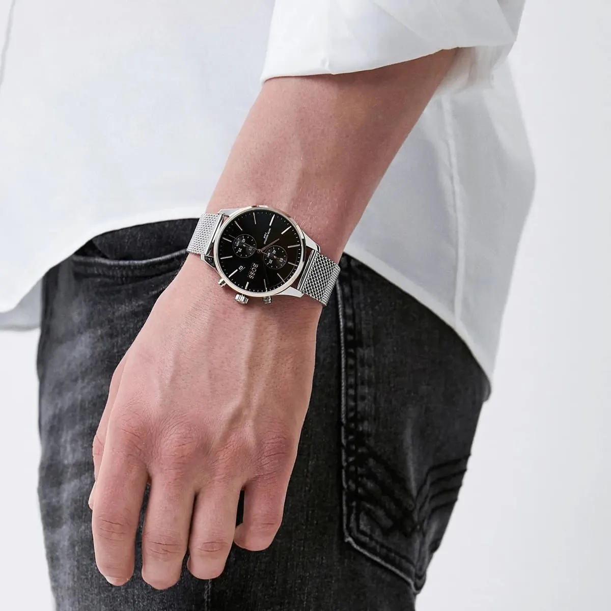 Elevate your sophisticated style with the original Hugo Boss men’s chronograph watch, model (Associate) 1513805. This striking timepiece features a bold black dial paired with a polished silver stainless steel bracelet, blending modern luxury with precise functionality.