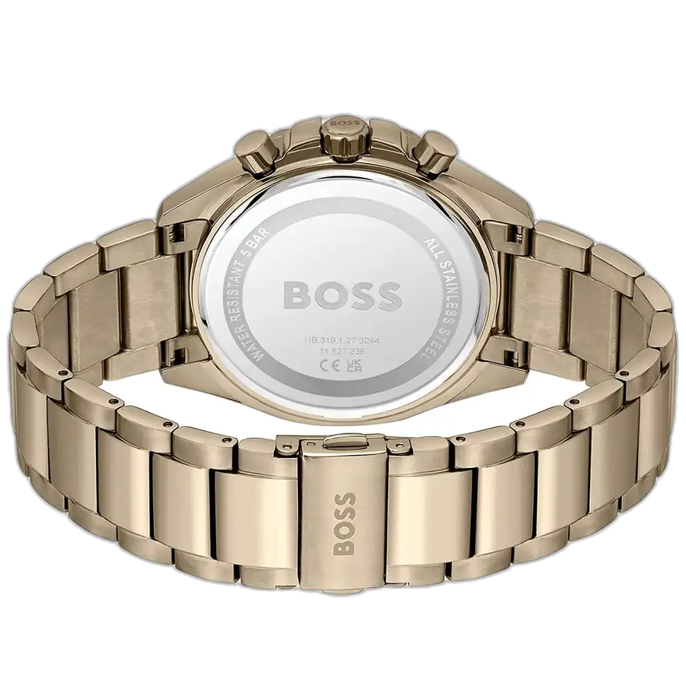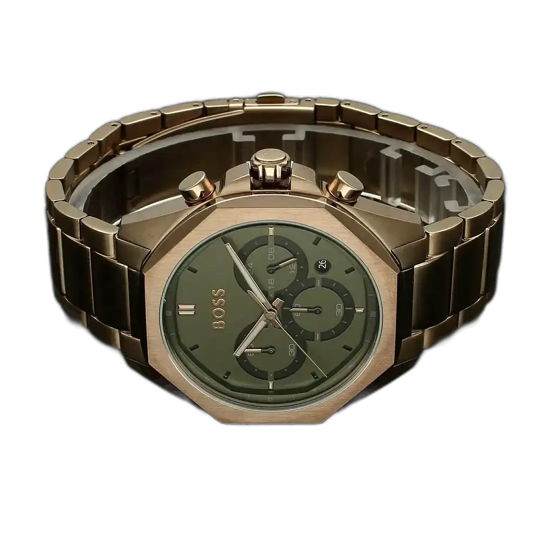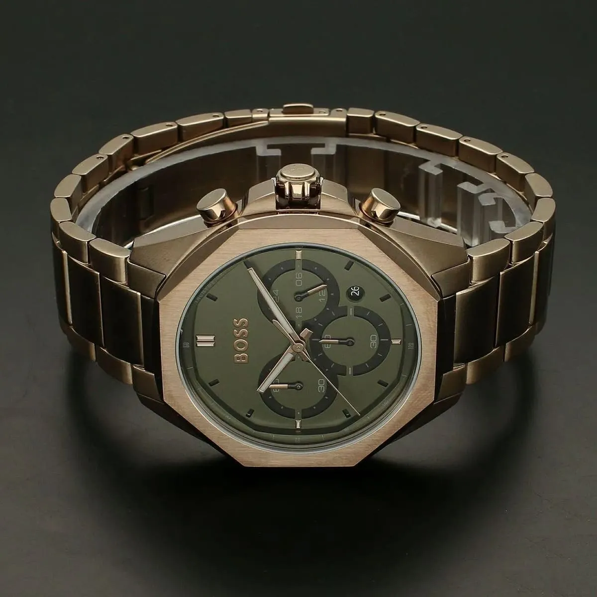The watch features a substantial 44 mm stainless steel case with a bronze-toned finish, housing a deep grey dial with an elegant sunray finish. This Hugo Boss Cloud chronograph is equipped with essential features for the active and professional wearer, including three functional sub-dials for precise chronograph timing (seconds, minutes, and 24-hour display) and a practical date window. The hands and markers are accented for superior readability against the dial, ensuring you can keep track of time instantly and accurately. The Cloud 1514019 is powered by a reliable quartz movement, guaranteeing the uncompromising accuracy that you can trust. The matching bronze-toned stainless steel bracelet with a secure push-button deployment clasp ensures comfort, durability, and a sleek, versatile aesthetic. The impeccable finish on the case and bracelet highlights the luxury craftsmanship synonymous with the brand.