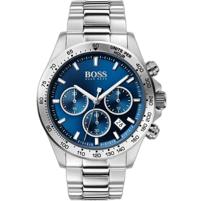 Embrace pure speed with the iconic Hugo Boss Hero 1513755 chronograph. This original racing-inspired timepiece combines a striking blue sunray dial and a robust silver stainless steel bracelet, offering a powerful, classic monochrome style with high-performance appeal.