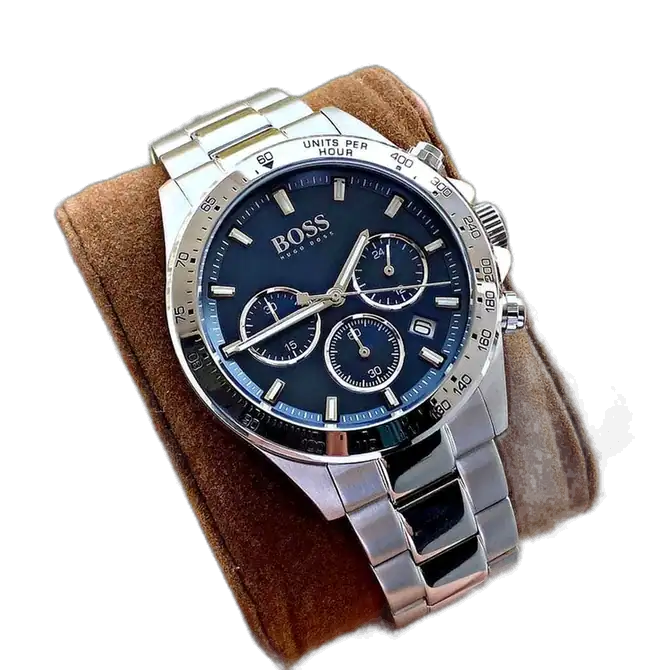 This classic Hugo Boss Hero Blue Silver watch boasts full chronograph functionality with three subdials and a date window at 4:30. Powered by a precise quartz movement, the 1513755 guarantees consistent and reliable performance. The durable stainless steel bracelet is secured with a dependable deployment clasp, ensuring long-term comfort and style during active wear.