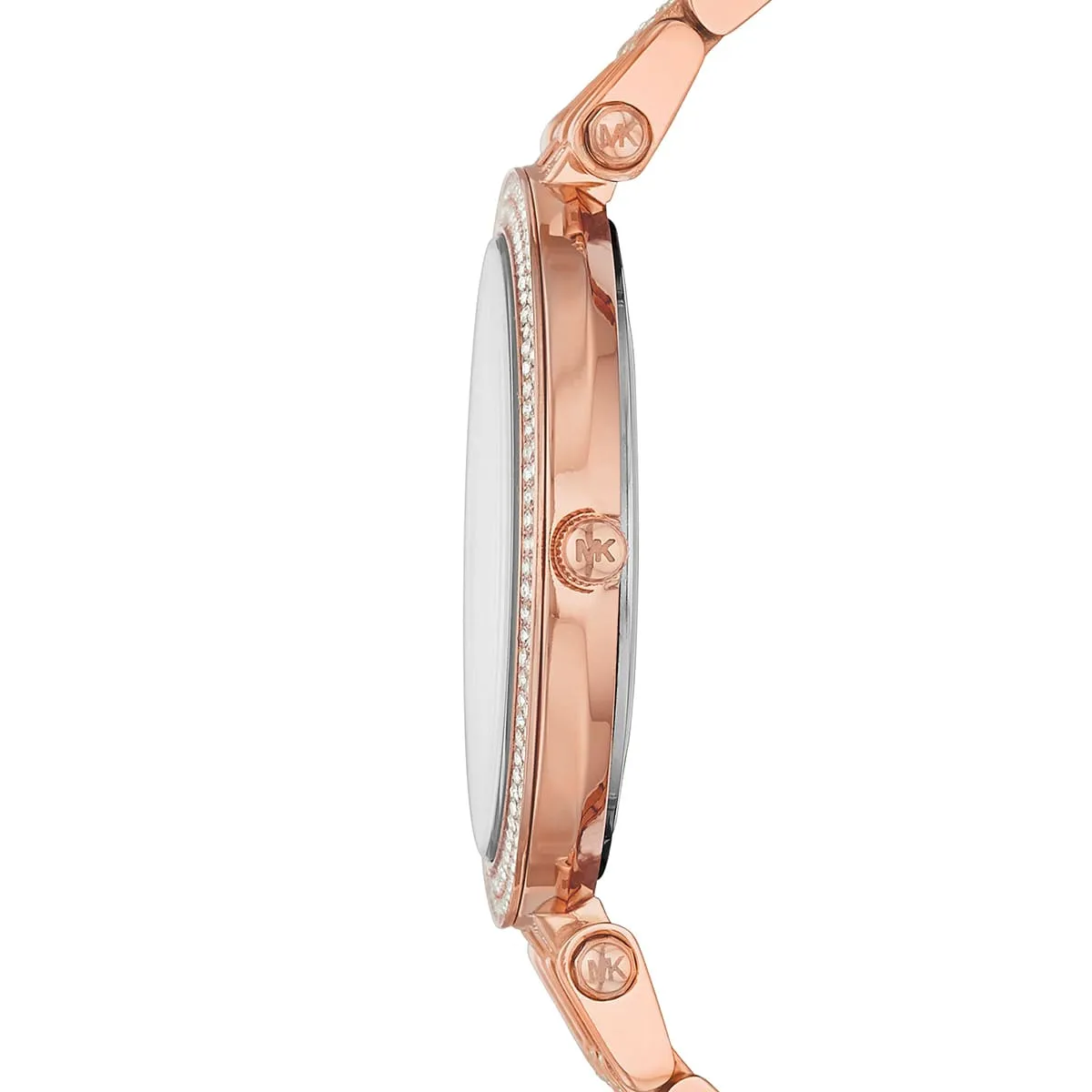 The original Michael Kors MK3220 Watch (Darci) is a radiant statement of contrast. This ladies’ timepiece features a flattering 39mm rose gold-tone case with a sparkling crystal-set bezel, a crisp white dial, and a polished rose gold-tone stainless steel bracelet. It’s the perfect accessory for adding a touch of warm, bright luxury to any look. Water resistant up to 5 ATM.