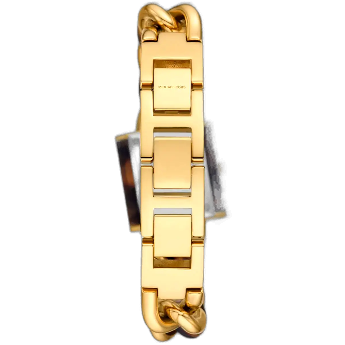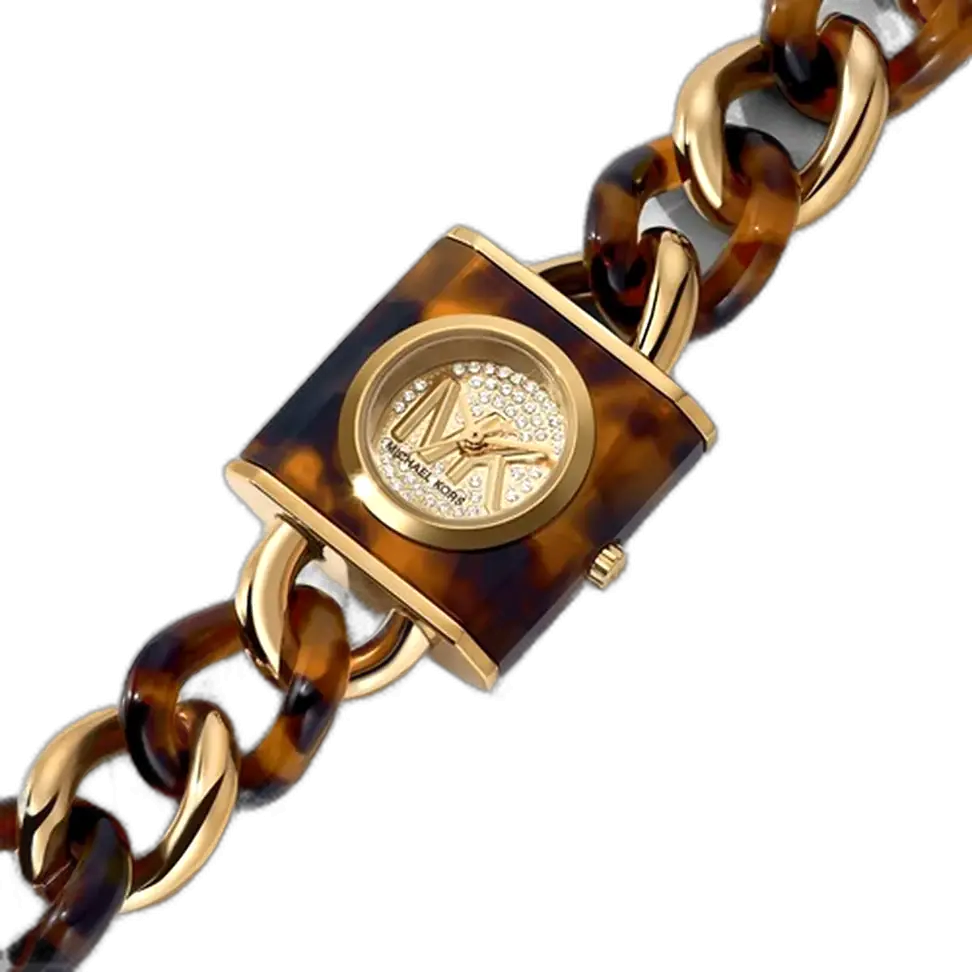 The bracelet of the Michael Kors MK4808 Watch is its most unique and defining feature. This is a Multi-Material design, combining Gold-Tone stainless steel links with links made from Brown Acetate or Resin. This fusion of rich metal and warm, glossy brown material creates a sophisticated textural contrast. Furthermore, the bracelet incorporates chain-lock inspired elements or structural pieces that mimic jewelry clasps, resulting in a form that is instantly striking and unconventional. This integrated design ensures the watch is a deliberate, luxurious fashion accessory. The watch is built for dependable performance, housing a reliable Quartz Three-Hand Movement, which provides accurate timekeeping. Protecting the exquisite dial is a durable Mineral Crystal, offering excellent resilience against daily impacts and wear.