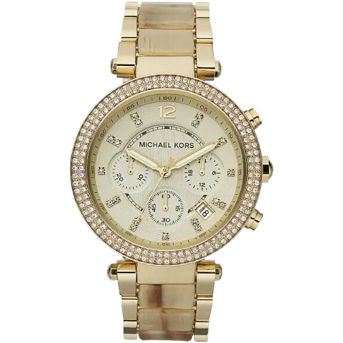 The bracelet of the Michael Kors MK5632 Watch is its most distinctive feature, reinforcing its luxurious, everyday appeal. It is a Multi-Material design, expertly combining polished Gold-Tone stainless steel links with corresponding links made from Gold-Tone Acetate or Resin. This fusion of metal and glossy material creates a sophisticated textural difference, making the bracelet feel more dimensional and unique than a purely metallic one. For practical daily use, the watch maintains a rating of 50 Meters (5 ATM) of water resistance. This protects the timepiece against moisture, splashes, and brief immersion, making it suitable for routine activities. The powerful combination of sporty function, continuous Gold-Tone color, and the opulent crystal and material work makes the MK5632 a truly versatile and instantly recognizable symbol of luxury.