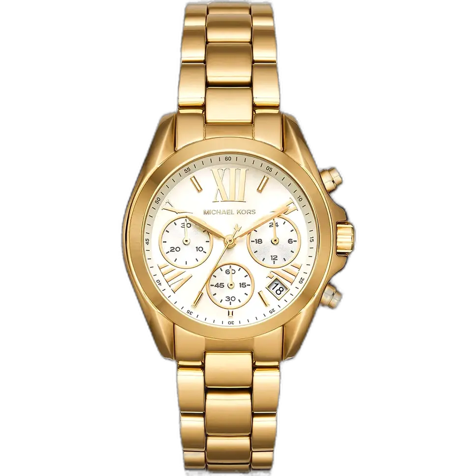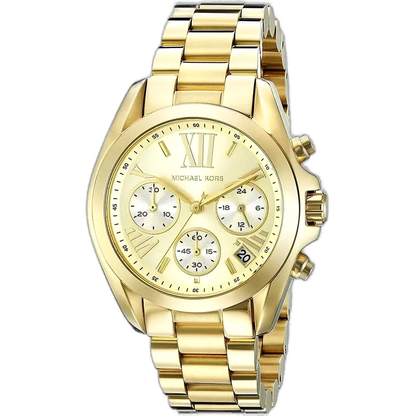 The original Michael Kors MK6267 (Bradshaw) is an opulent, oversized chronograph. This ladies’ watch features a large 43mm case, a luxurious all-gold-tone stainless steel finish, and a crisp white dial with Roman numerals and chronograph sub-dials. It’s the perfect accessory for powerful, rich styling. Water resistant up to 10 ATM.