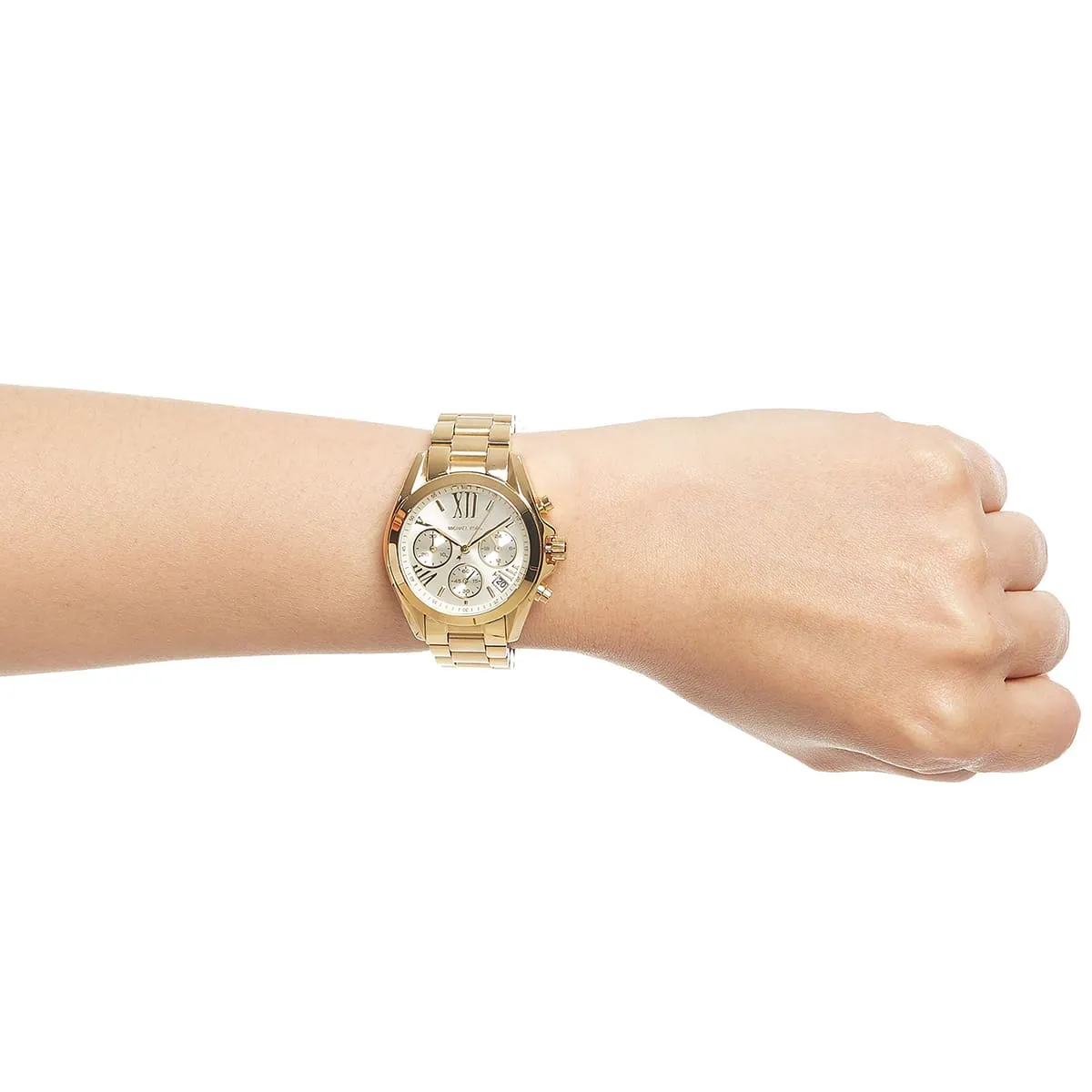 The bracelet of the Michael Kors MK6267 Watch reinforces its robust and luxurious appeal. It is crafted from durable Stainless Steel and finished entirely in the radiant Gold-Tone. The integrated link design, characteristic of the Bradshaw collection, provides a substantial, yet exceptionally comfortable feel on the wrist. For superior practicality, the watch boasts a rating of 100 Meters (10 ATM) of water resistance. This excellent water resistance makes the Michael Kors MK6267 Watch suitable for swimming and ensures reliability under various conditions, seamlessly combining high performance with high fashion.