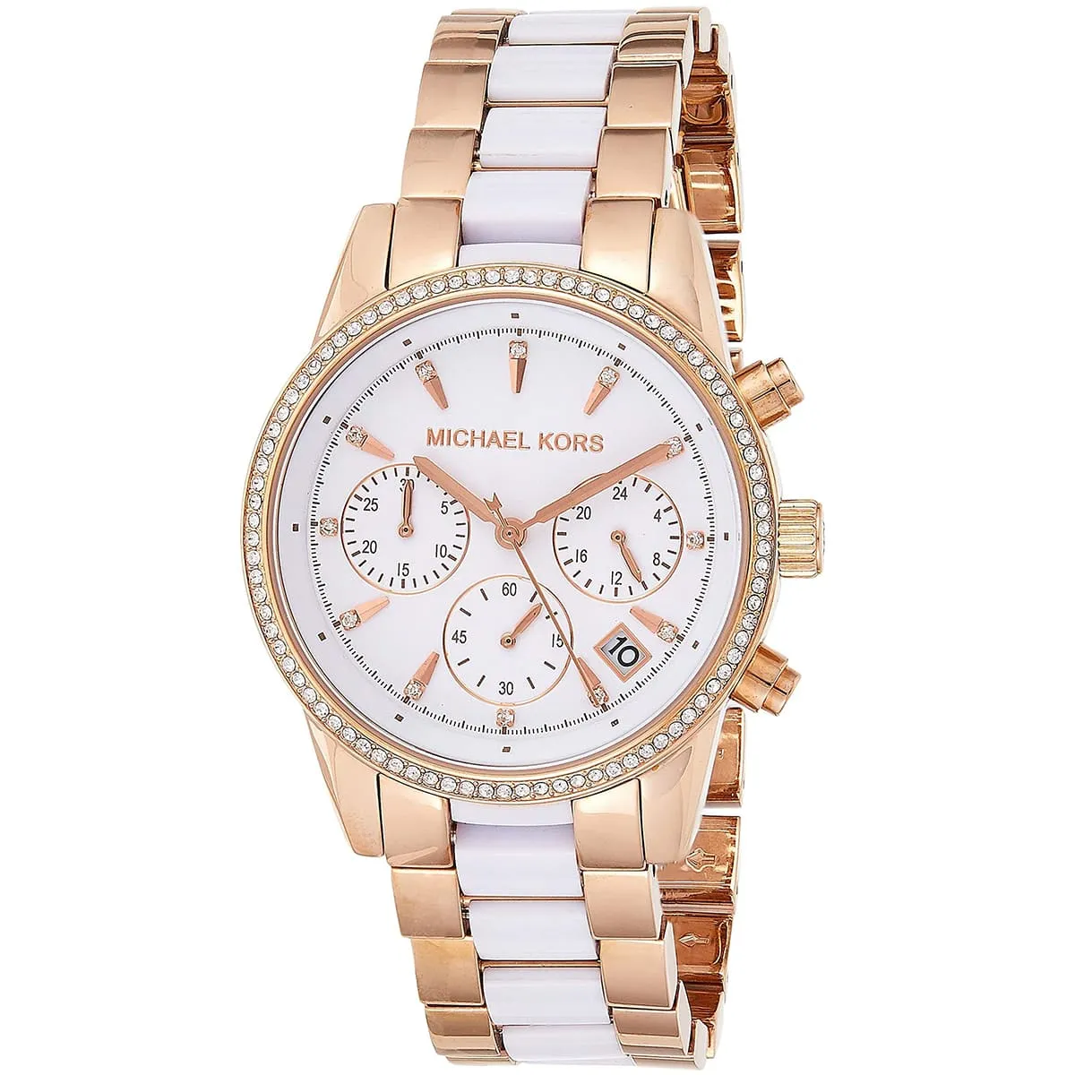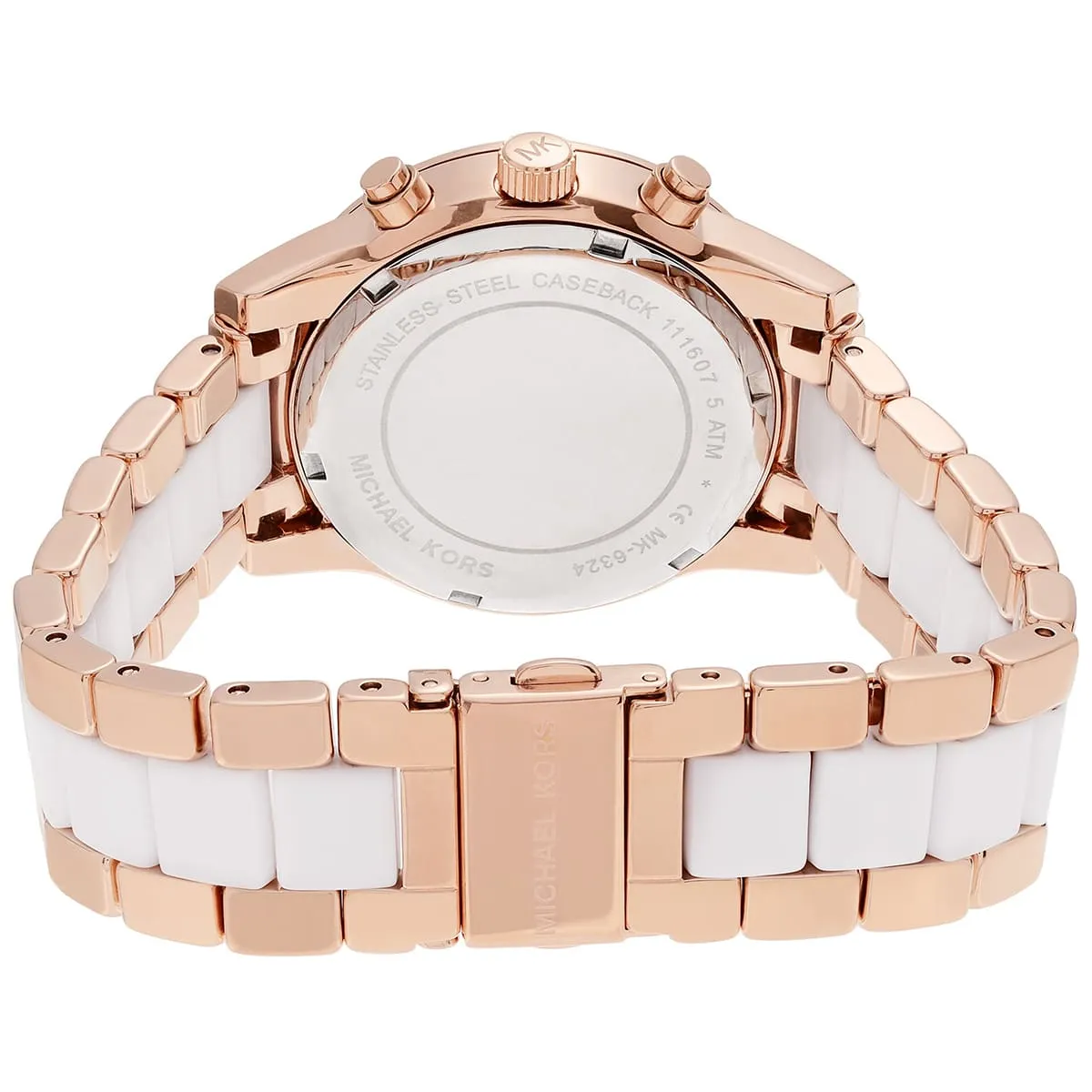 The original Michael Kors MK6324 (Ritz) is a luxurious, rose gold and white chronograph. This ladies’ watch features a refined 37mm case (approx), a precise chronograph movement, and a distinctive multi-material bracelet blending rose gold-tone links with crisp white acetate links. It’s the perfect accessory for chic, warm styling. Water resistant up to 5 ATM.