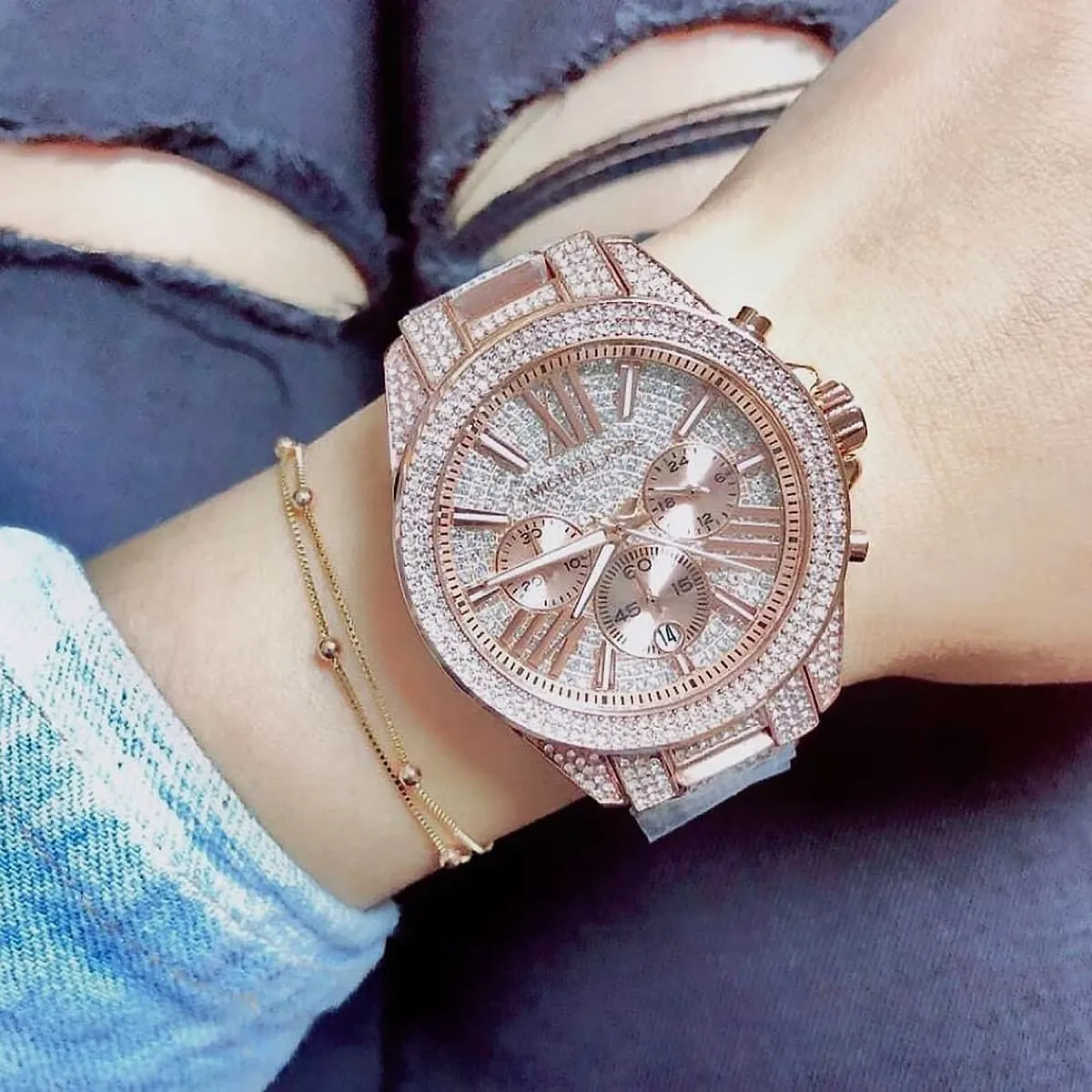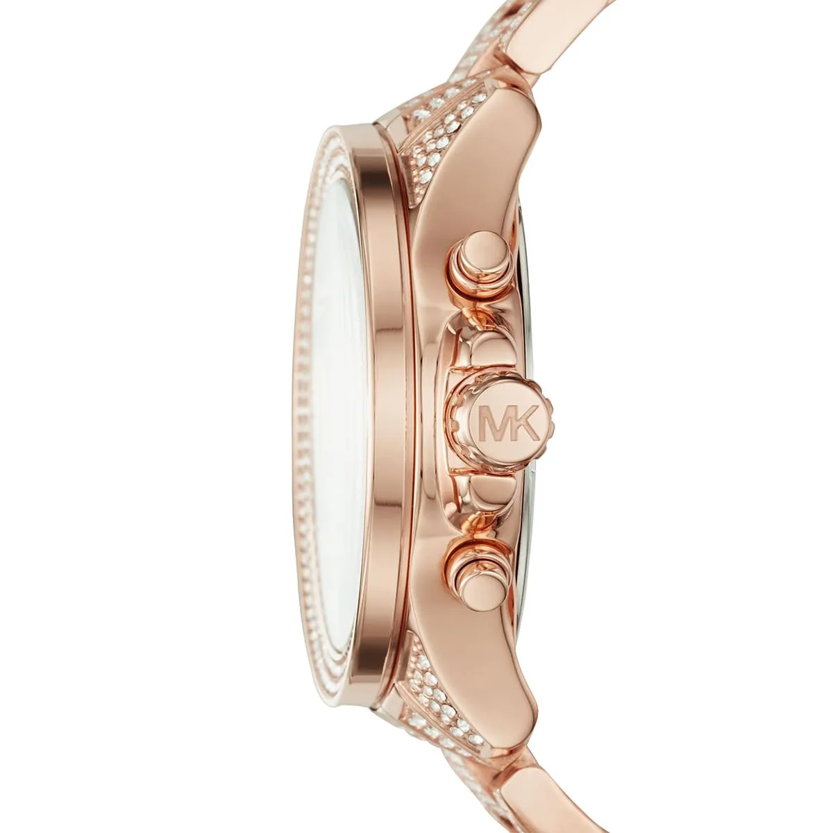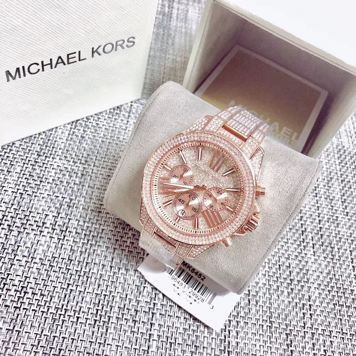 The core aesthetic of the Michael Kors MK6452 Watch is defined by its commitment to the warm metallic finish and functional elegance. The watch features a perfectly sized 42mm case (approx), crafted from durable stainless steel and finished with a uniform, high-polish Rose Gold-Tone plating. The bezel is fully set with brilliant Pavé crystals, creating a dazzling halo that instantly transforms the watch into an exquisite piece of jewelry. The dial maintains the elegant Rose Gold-Tone finish, where the three Chronograph sub-dials are clearly integrated, highlighting the watch’s performance capability. The hands and indices are rose gold-tone, maintaining clarity and elegance amidst the luxurious shine.