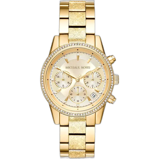 The Michael Kors MK6597 Watch from the iconic Ritz collection is a definitive luxury accessory that masterfully fuses robust chronograph functionality with high-end, classic glamour. This model is exceptionally desirable for its monochromatic Yellow Gold-Tone finish, which bathes the entire watch in a continuous, rich metallic warmth that remains timelessly chic. The Ritz design is known for its sporty, yet elegant profile (typically 37mm) and functional chronograph features. The watch is often elevated by the extensive application of brilliant crystals on the bezel, providing continuous sparkle. The Michael Kors MK6597 Watch is designed for the woman who demands a timepiece that is as practical and performance-driven as it is dazzling and sophisticated. It offers a strong visual presence, making it a high-impact statement piece.
