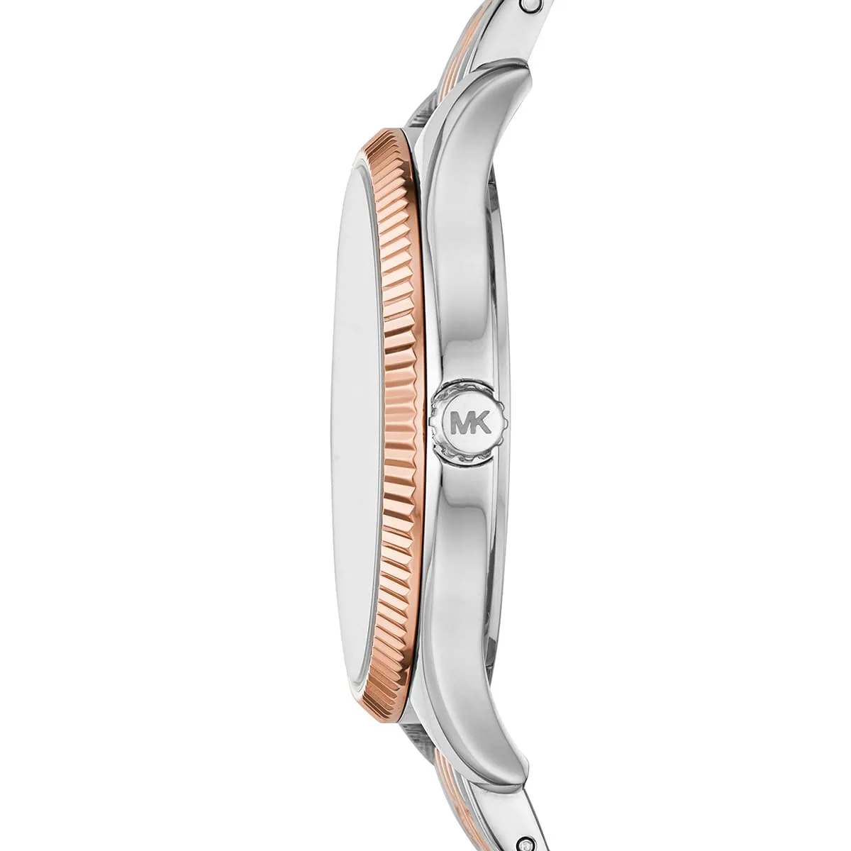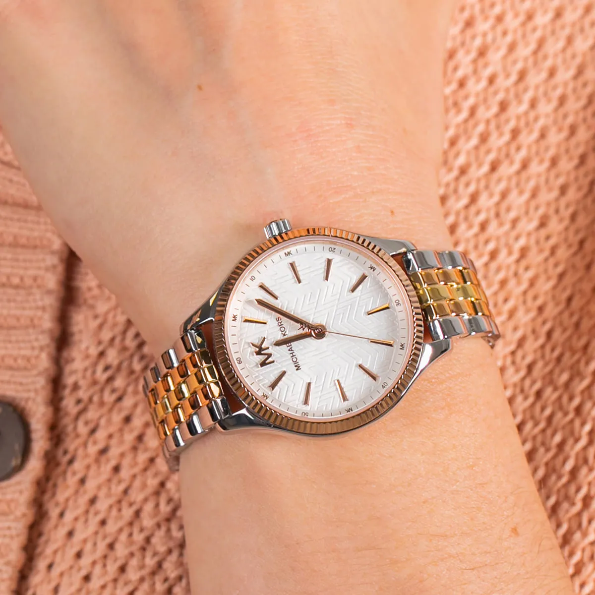 The original Michael Kors MK6642 (Lexington) is a versatile, multi-tone timepiece. This ladies’ watch features a 40mm case (approx), a rich multi-tone stainless steel finish blending silver, gold, and rose gold, and a crisp white dial with Roman numerals. It’s the perfect accessory for powerful, adaptive styling. Water resistant up to 5 ATM.