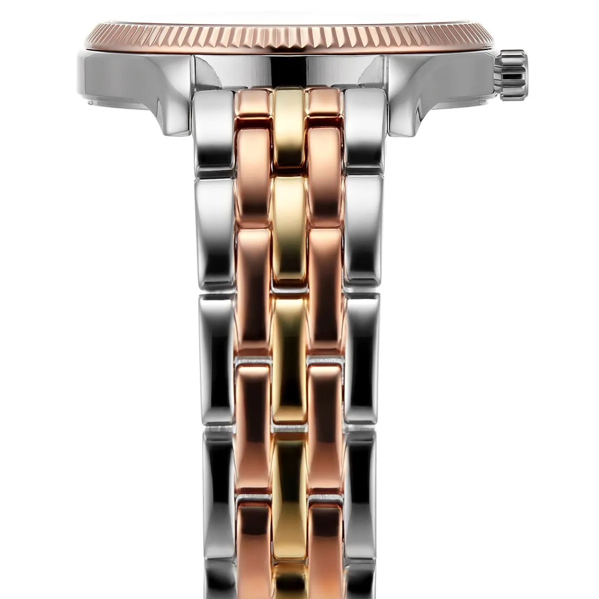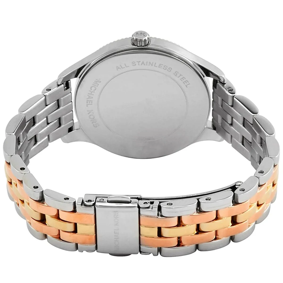 The bracelet of the Michael Kors MK6642 Watch is its most versatile element. It is crafted from robust Stainless Steel and showcases the intricate Multi-Tone finish, blending polished Silver-Tone, Yellow Gold-Tone, and Rose Gold-Tone links. This tri-tone application eliminates the challenge of clashing metals, making the MK6642 an indispensable accessory that pairs flawlessly with any other piece of jewelry. The integrated link design characteristic of the Lexington collection provides a comfortable feel on the wrist. For practical daily assurance, the watch maintains a rating of 50 Meters (5 ATM) of water resistance, offering appropriate protection against moisture and accidental splashes.