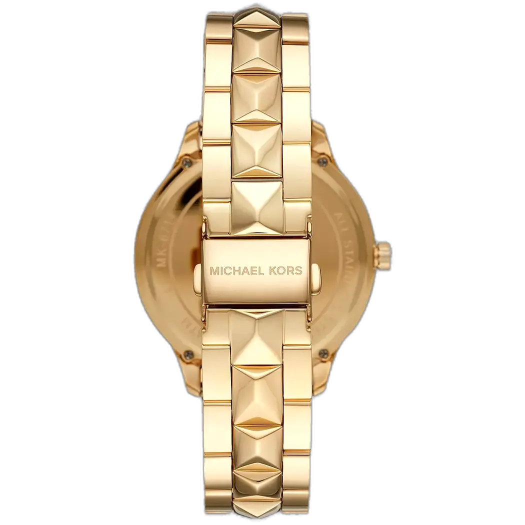 The bracelet of the Michael Kors MK6714 Watch reinforces its robust and luxurious appeal. It is crafted from durable Stainless Steel and finished entirely in the radiant Gold-Tone. The integrated link design, typical of the Runway collection, provides a fluid, yet exceptionally comfortable feel on the wrist, flowing elegantly from the case. The powerful combination of the sleek Runway profile, the continuous gold-tone finish, and brilliant crystal accents establishes it as an essential and highly fashionable statement piece in the Michael Kors collection.
