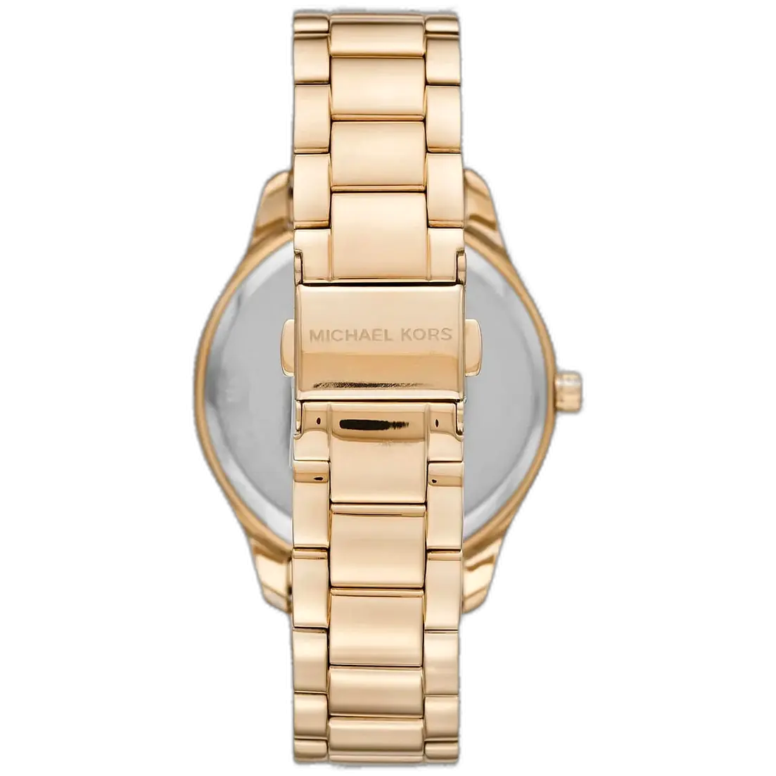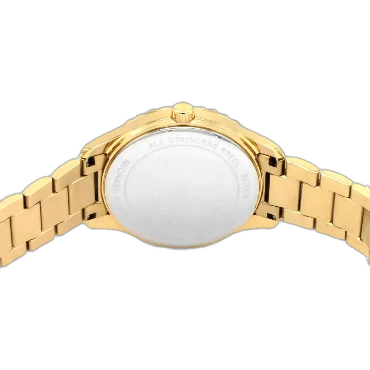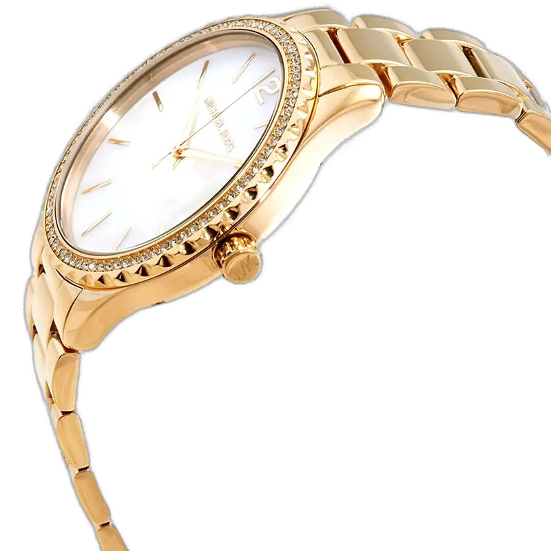 The core aesthetic of the Michael Kors MK6870 Watch is defined by the richness of the all-gold metal and the natural beauty of the dial. The round case (typically 38mm-40mm) is expertly crafted from durable stainless steel and features a uniform, high-polish Gold-Tone plating. The bezel is often polished or set with crystals, framing the dial beautifully. The dial is the centerpiece, showcasing a unique Mother-of-Pearl finish with a marbled or textured effect (Bumpy/Wrinkled). This natural, iridescent patterning, often appearing white with subtle shifts in color, ensures that no two watches are exactly alike, lending the piece its truly Unique and luxurious character. The watch utilizes simple stick indices, often accented with crystals, and hands finished in gold-tone to unify the warm elements.