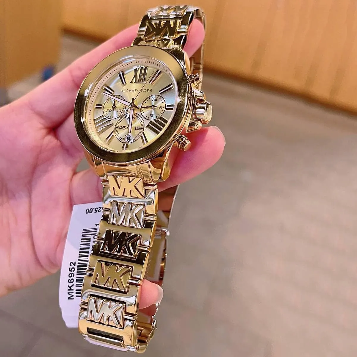 The core aesthetic of the Michael Kors MK6952 Watch is defined by its unwavering commitment to the radiant Yellow Gold-Tone. The large round case (typically 42mm in diameter) is expertly crafted from durable stainless steel and finished with a uniform, high-polish Gold-Tone plating. The bezel is often set with brilliant crystals (Pavé) or highly polished, providing Michael Kors’ signature touch of sparkle. The dial maintains a seamless, matching Gold-Tone finish, reinforcing the elegant, monochromatic aesthetic. The watch utilizes simple stick indices and hands, often featuring subtle crystal accents, and the MK logo is proudly displayed, confirming its designer heritage. This sophisticated design successfully blends the boldness of an oversized watch with the richness of classic gold.