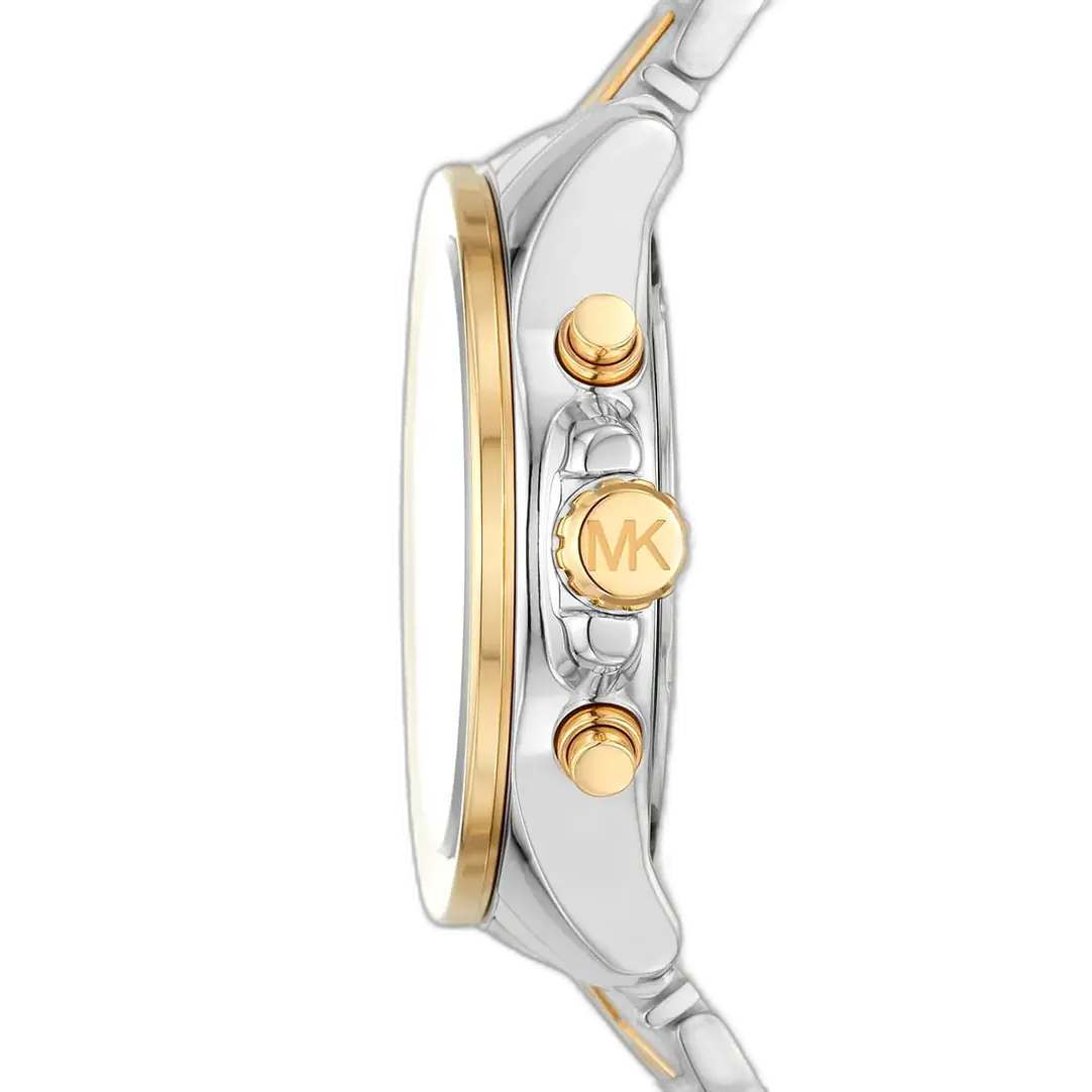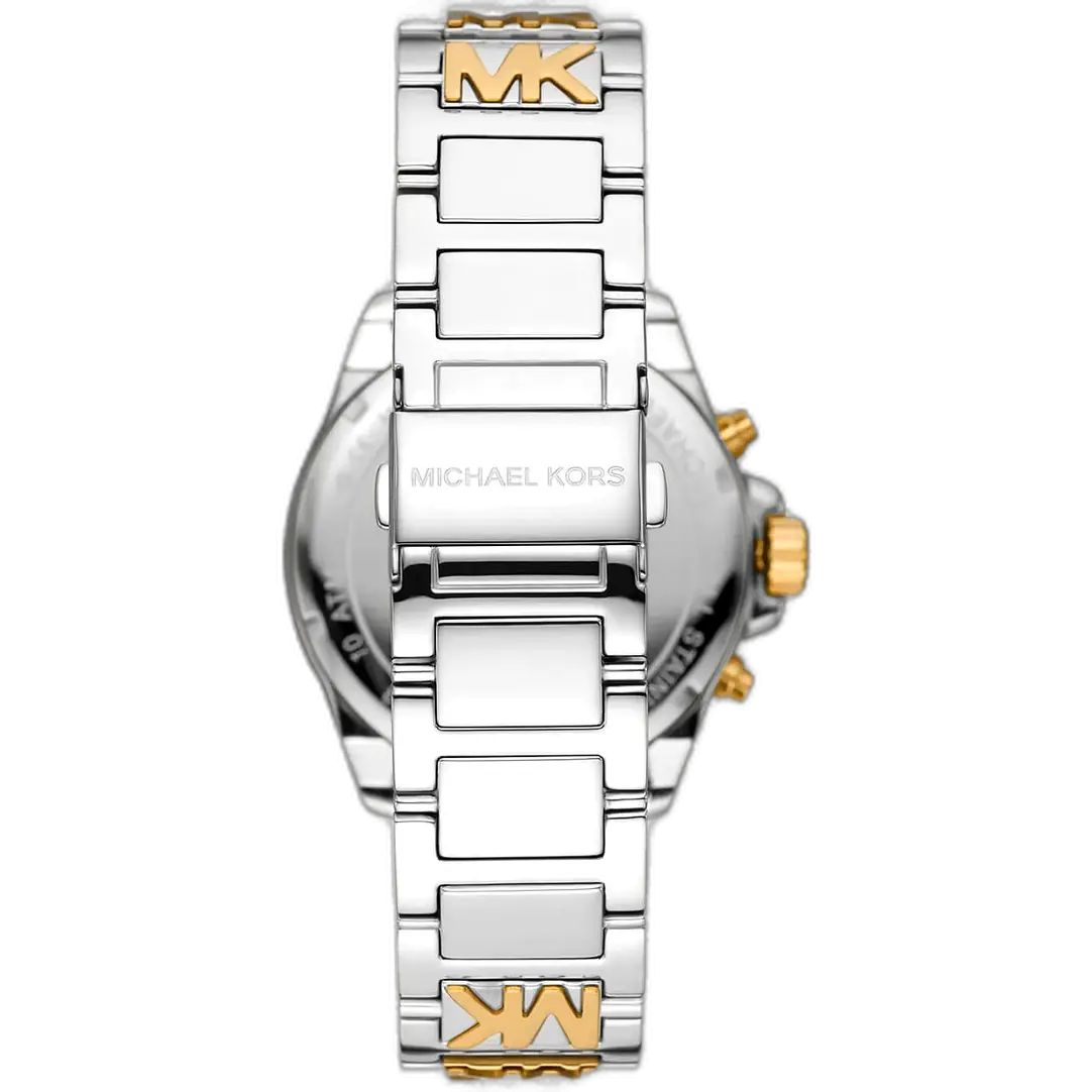 The core aesthetic of the Michael Kors MK6953 Watch is defined by the harmonious contrast of the dual metallic tones. The large round case (typically 42mm in diameter) is expertly crafted from durable stainless steel and features a sophisticated two-tone finish. The Silver-Tone forms the primary casing, while the Gold-Tone provides elegant accents on the bezel, crown, and inner links of the bracelet. The dial maintains an elegant Silver-Tone or white finish, providing a clean backdrop to the metallic accents. The watch utilizes simple stick indices and hands, designed to unify the dual metallic finish, maintaining clarity and reinforcing the refined look. The bezel is often fully set with brilliant crystals (Pavé), adding Michael Kors’ signature touch of continuous sparkle.