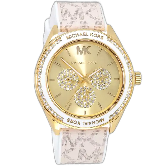 The original Michael Kors MK7204 (Jessa) is a chic, sporty timepiece. This ladies’ watch features a refined 38mm case (approx), a luxurious gold-tone stainless steel finish, and a crisp white silicone strap. It’s the perfect accessory for making a fashionable, bold statement with optimal comfort. Water resistant up to 5 ATM.