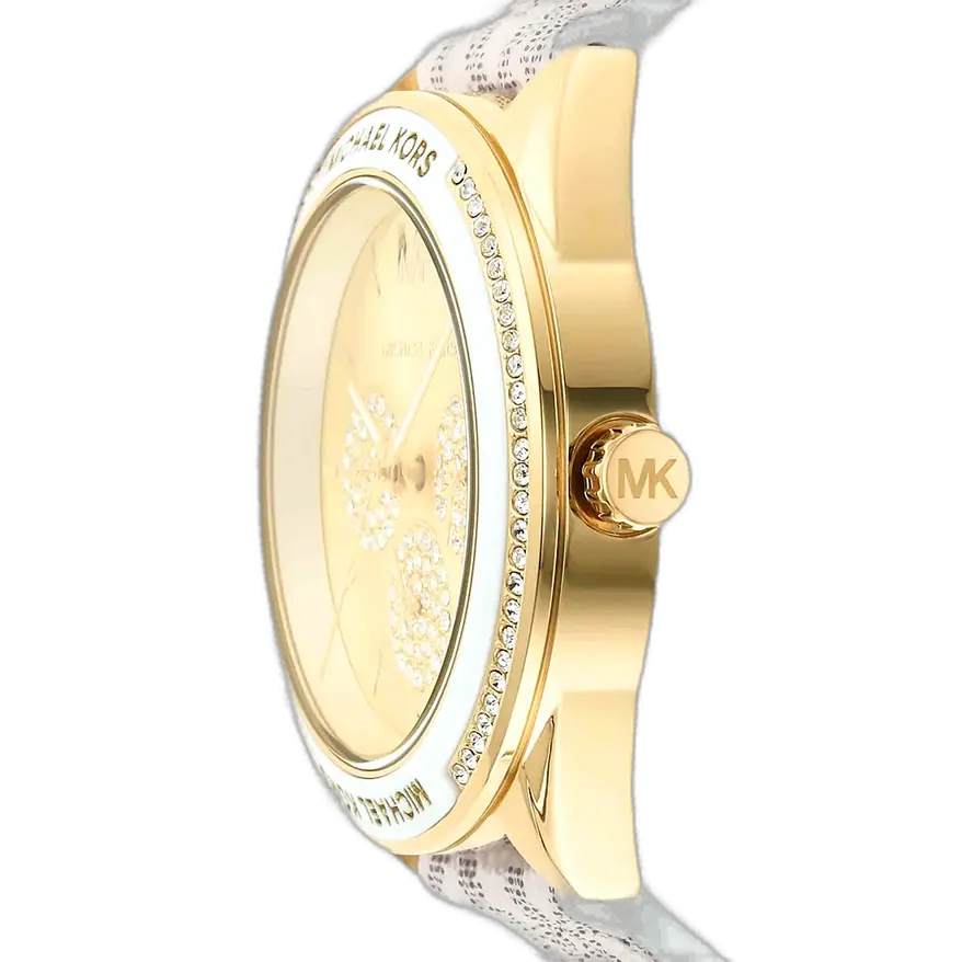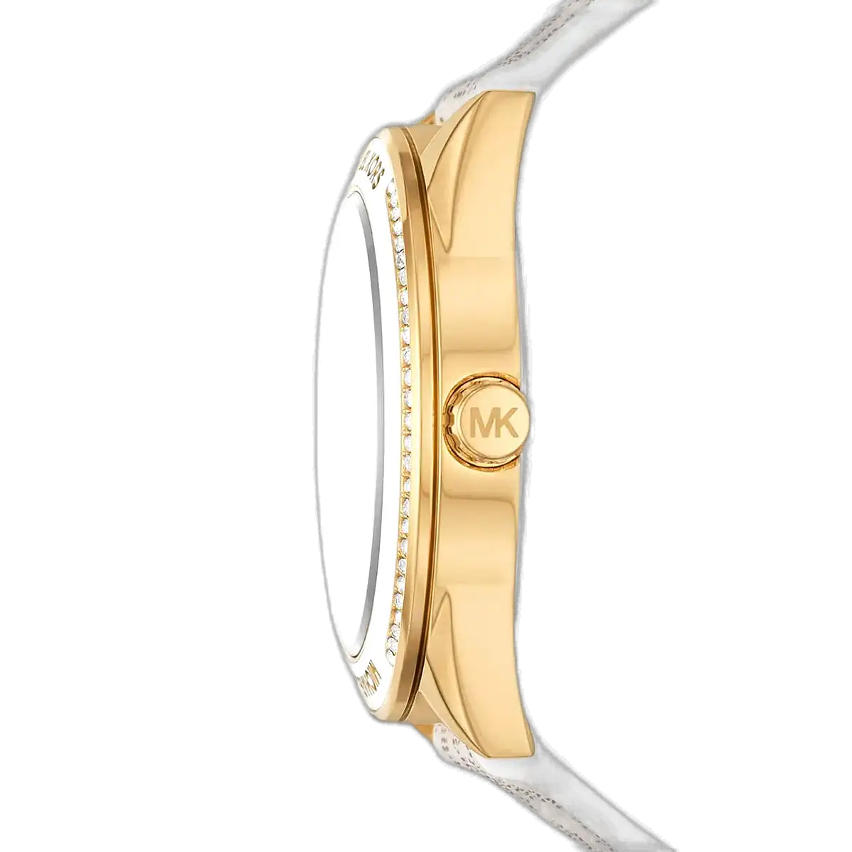 The core aesthetic of the Michael Kors MK7204 Watch is defined by the powerful interplay between warm metal and pristine white. The round case (typically 38mm) is expertly crafted from durable stainless steel and finished with a uniform, high-polish Gold-Tone plating. The dial maintains a matching Gold-Tone finish, reinforcing the continuity of the warm metal. The watch utilizes simple stick indices and hands, maintaining clarity and reinforcing the sleek, minimalist look. The bezel is simple and polished, focusing attention on the bold color combination. The elegant case profile ensures the watch remains feminine while making a strong visual statement.