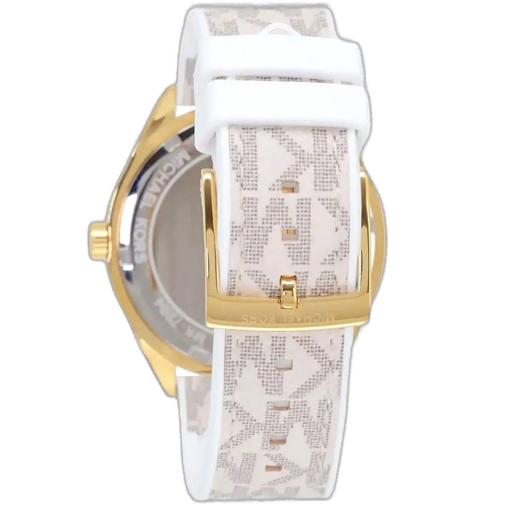 The Michael Kors MK7204 Watch is a definitive accessory for high-impact, chic style. Its warm Gold-Tone finish, combined with the comfortable white silicone strap and modern Jessa profile, establishes it as an essential and highly fashionable statement piece in the Michael Kors collection.