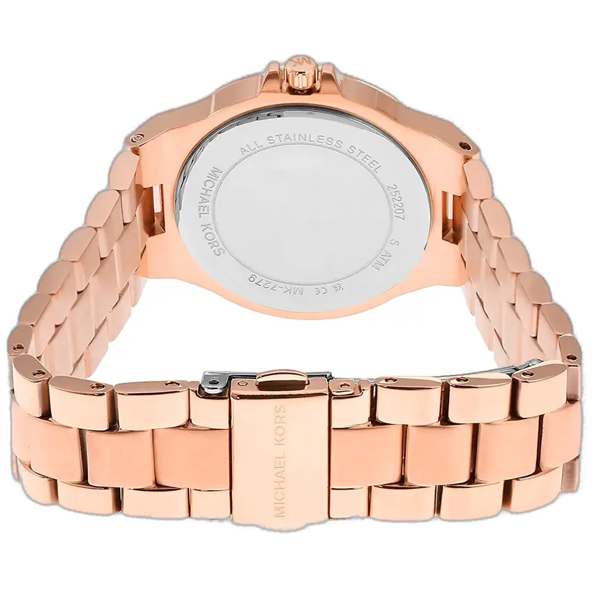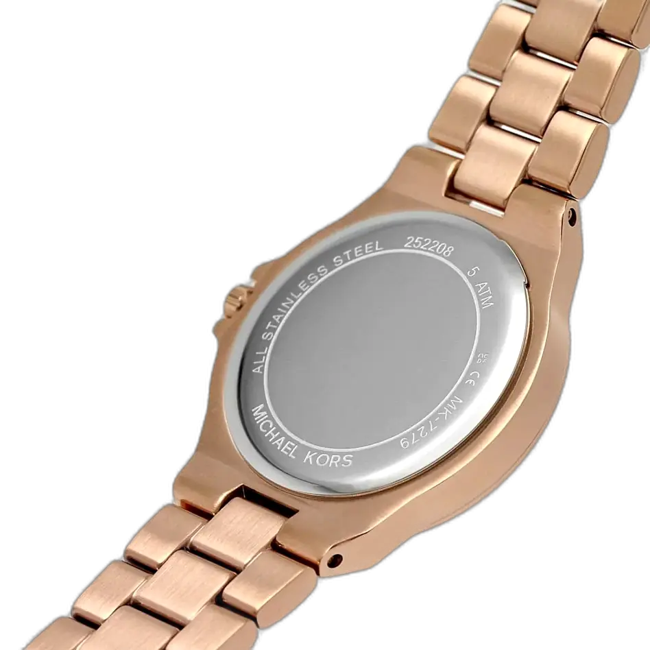 The core aesthetic of the Michael Kors MK7279 Watch is defined by its commitment to the radiant Rose Gold-Tone and the contrast of the white dial. The large round case (typically 42mm or more) is expertly crafted from durable stainless steel and finished with a uniform, high-polish Rose Gold-Tone plating. The bezel is often set with brilliant Pavé crystals, adding Michael Kors’ signature touch of sparkle. The dial maintains a seamless, crisp White finish, providing an elegant, high-contrast backdrop to the rose gold accents. The watch utilizes bold stick indices, sometimes featuring chronograph sub-dials (consistent with the Lennox style), maintaining clarity and reinforcing the refined look. This design successfully blends the boldness of an oversized watch with the contemporary richness of rose gold.