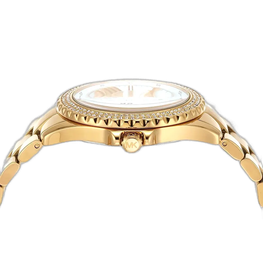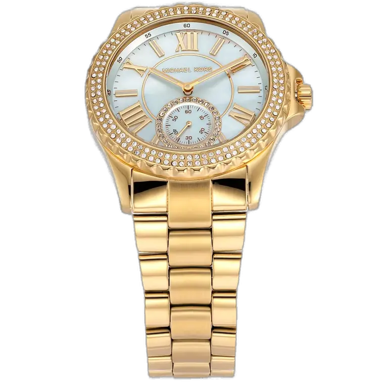 The core aesthetic of the Michael Kors MK7401 Watch is defined by the richness of the all-gold metal and the natural beauty of the dial. The round case (typically 40mm-42mm) is expertly crafted from durable stainless steel and features a uniform, high-polish Gold-Tone plating. The bezel is often polished or fully set with crystals (Pavé), framing the dial beautifully. The dial is the centerpiece, showcasing a unique Mother-of-Pearl finish with a marbled or textured effect (Bumpy/Wrinkled). This natural, iridescent patterning ensures that no two watches are exactly alike, lending the piece its truly Unique and luxurious character. The watch utilizes simple stick indices and hands finished in gold-tone to unify the warm elements. This model typically features a multi-function or chronograph movement, consistent with the Everest line.