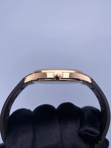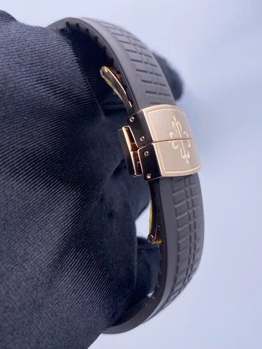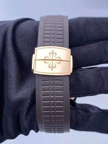 A defining feature of the Patek Philippe Aquanaut Watch is the Brown Tropical Rubber Strap. This strap is made from a composite material that is resistant to tension, salt water, and UV degradation, offering extreme durability and superior comfort. The strap features a pattern that mirrors the dial and is secured by a signature fold-over clasp. The strap’s resilience makes it a perfect complement to the robust Rose Gold-Tone case.