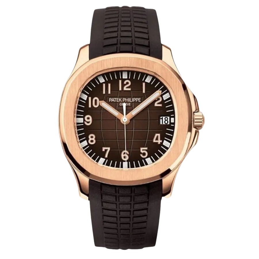The core aesthetic of the Patek Philippe Aquanaut Watch is defined by its substantial profile and warm metallic finish. The Case is finished in a polished Rose Gold-Tone, providing a luxurious and distinctive appeal. The Brown Dial is the focal point, captivating with its signature embossed grid pattern (checkerboard or grenade-like texture), which visually matches the pattern on the rubber strap. The dial features highly legible Arabic Numerals and luminous hands. The watch displays the date at 3 o’clock.