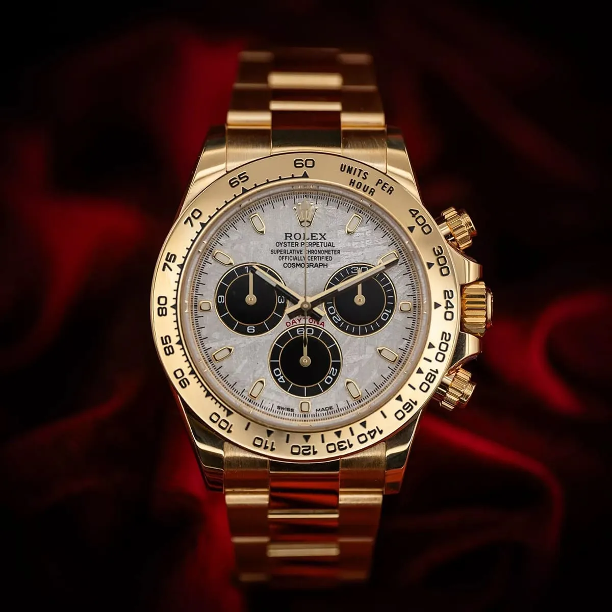 Embody the spirit of speed and victory with the Rolex Cosmograph Daytona. An icon of racing and prestige, this timepiece features an elegant gold metal strap.