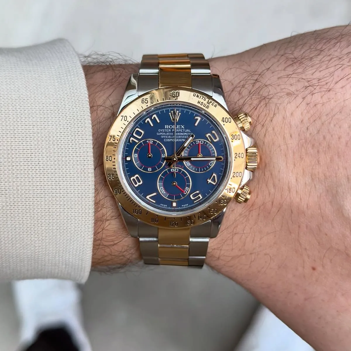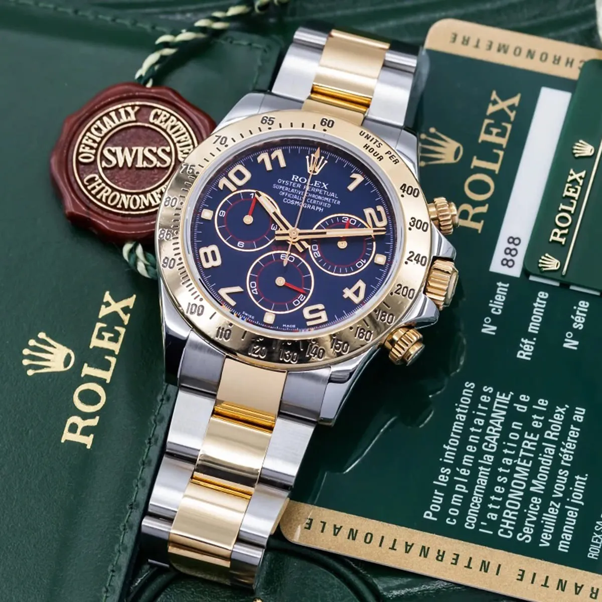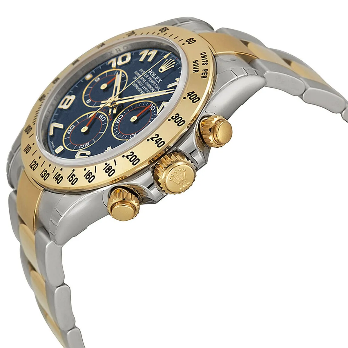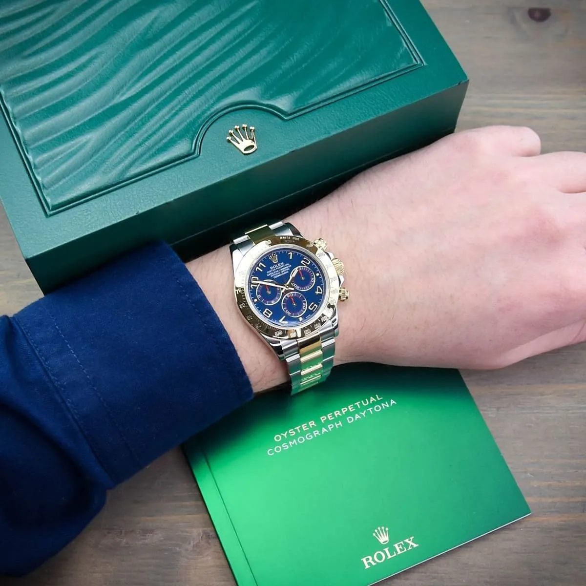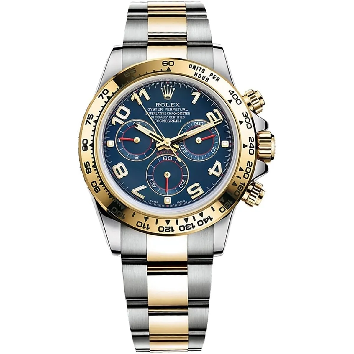 Step into the world of high-performance horology with the Rolex Cosmograph Daytona, a watch born from the world of motorsport. Since its launch in 1963, the Daytona has been the ultimate tool for endurance racing drivers and a symbol of luxury and precision. This particular model, the reference 116523, with its captivating blue dial and luxurious two-tone silver and gold metal strap, is a testament to Rolex’s timeless design and impeccable craftsmanship. It is more than just a watch; it is a legendary icon that combines racing heritage with unparalleled elegance.