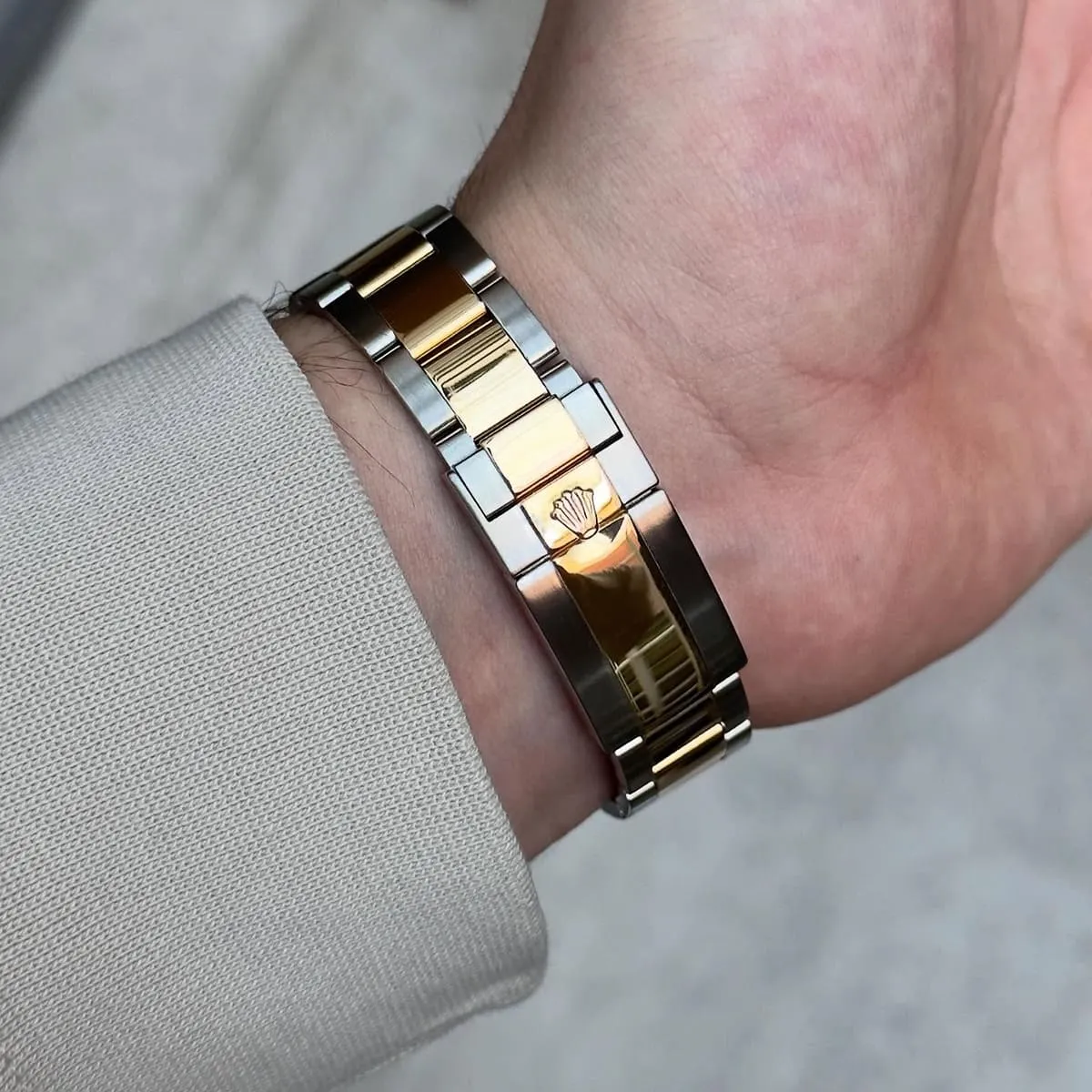 Embody the spirit of speed and victory with the Rolex Cosmograph Daytona. An icon of racing and prestige, this timepiece features an elegant two-tone silver and gold metal strap.