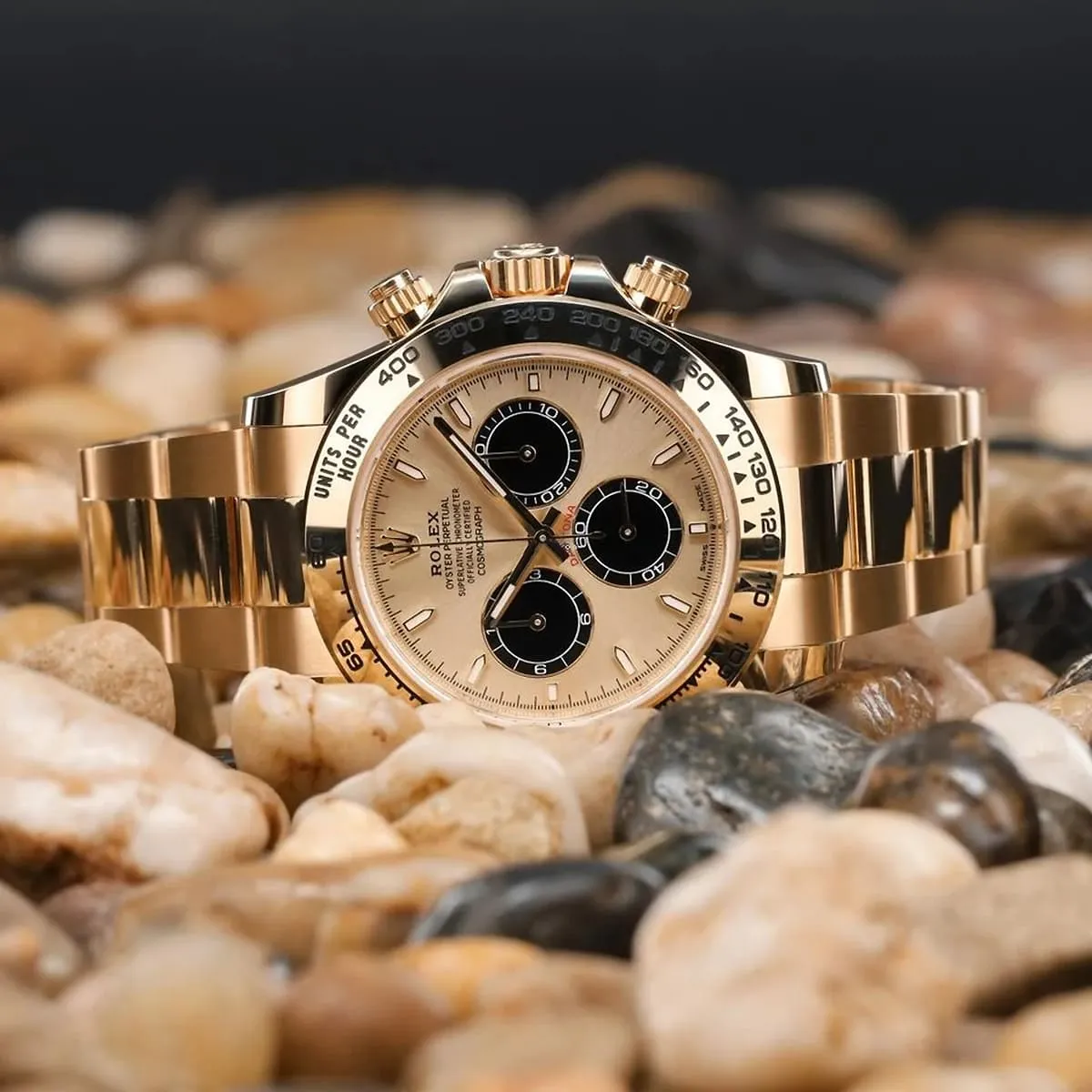 Embody the spirit of speed and victory with the Rolex Cosmograph Daytona. An icon of racing and prestige, this timepiece features an elegant all-gold metal strap.