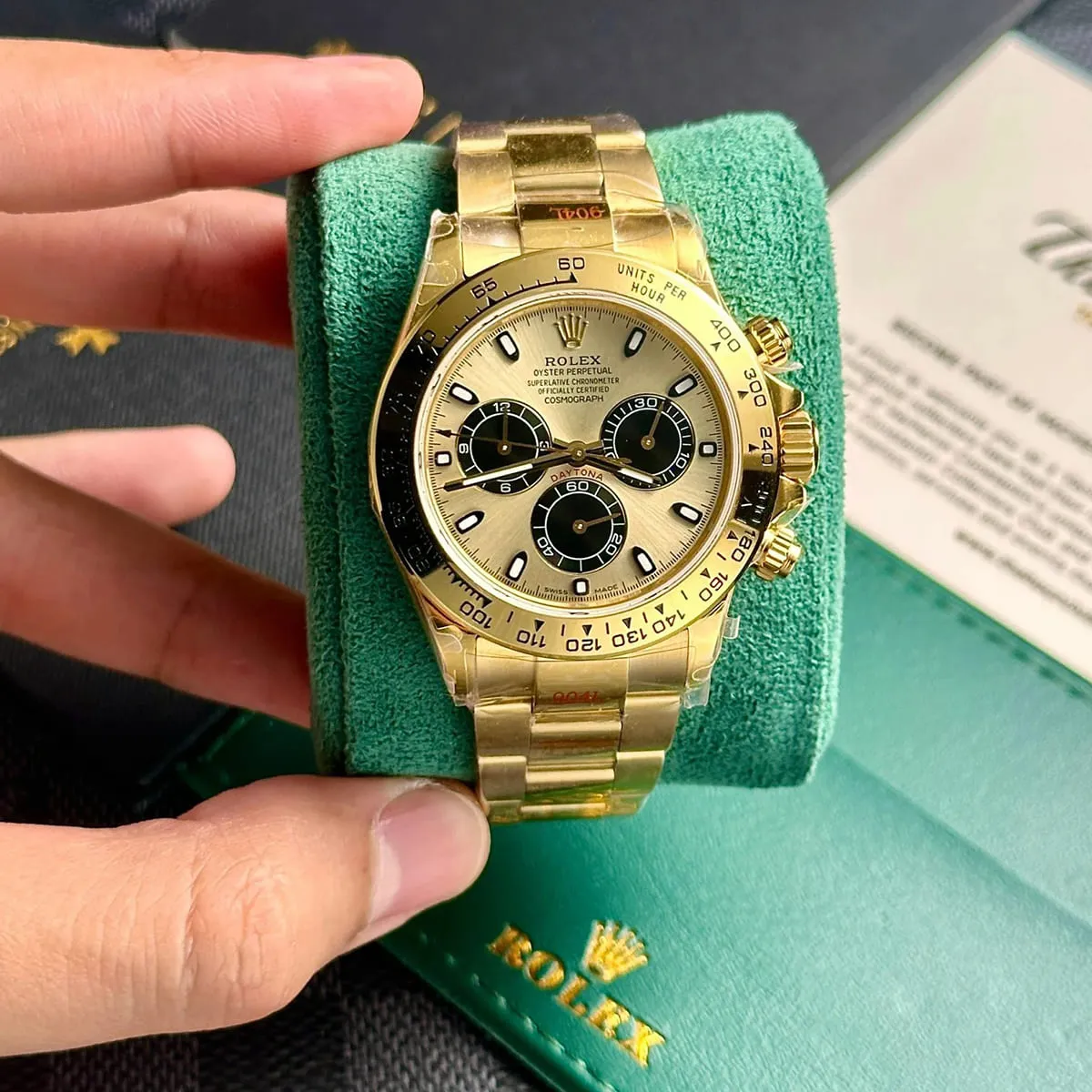 Step into the world of high-performance horology with the Rolex Cosmograph Daytona, a watch born from the world of motorsport. Since its launch in 1963, the Daytona has been the ultimate tool for endurance racing drivers and a symbol of luxury and precision. This particular model, the reference 126508, with its captivating gold dial and luxurious all-gold metal strap, is a testament to Rolex’s timeless design and impeccable craftsmanship. It is more than just a watch; it is a legendary icon that combines racing heritage with unparalleled elegance.