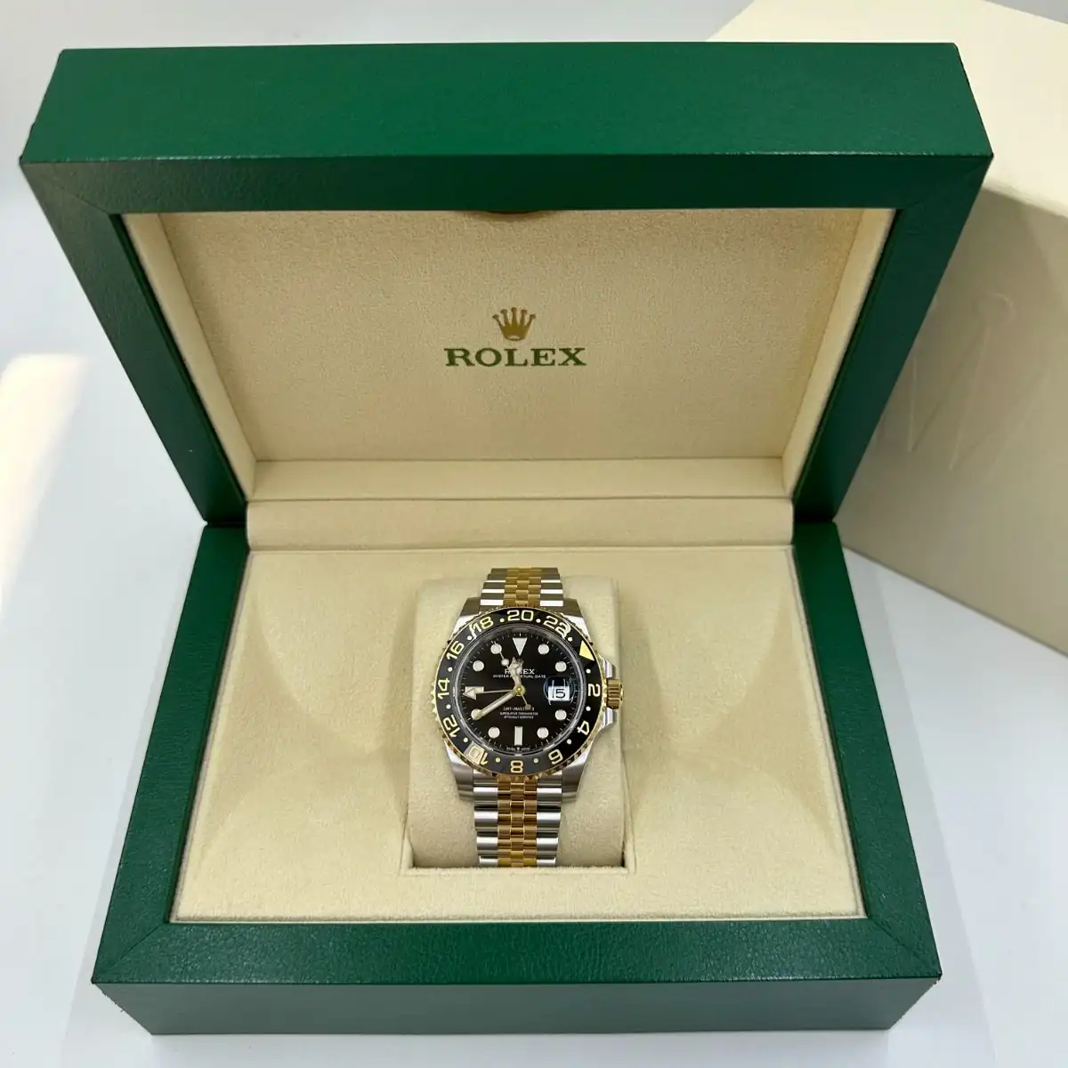 The Rolex GMT-Master II Watch in its prestigious two-tone gold and silver edition is a breathtaking masterpiece of international luxury. Combining 18k yellow gold tones with premium silver stainless steel, this iconic 40mm mirror original timepiece features a legendary black ceramic bezel and dual-time functionality, offering an incredible executive presence for the global elite.