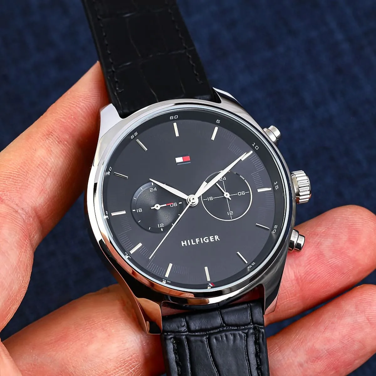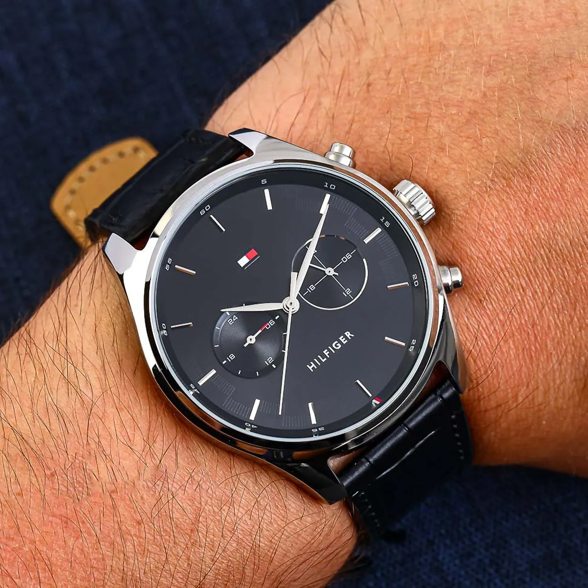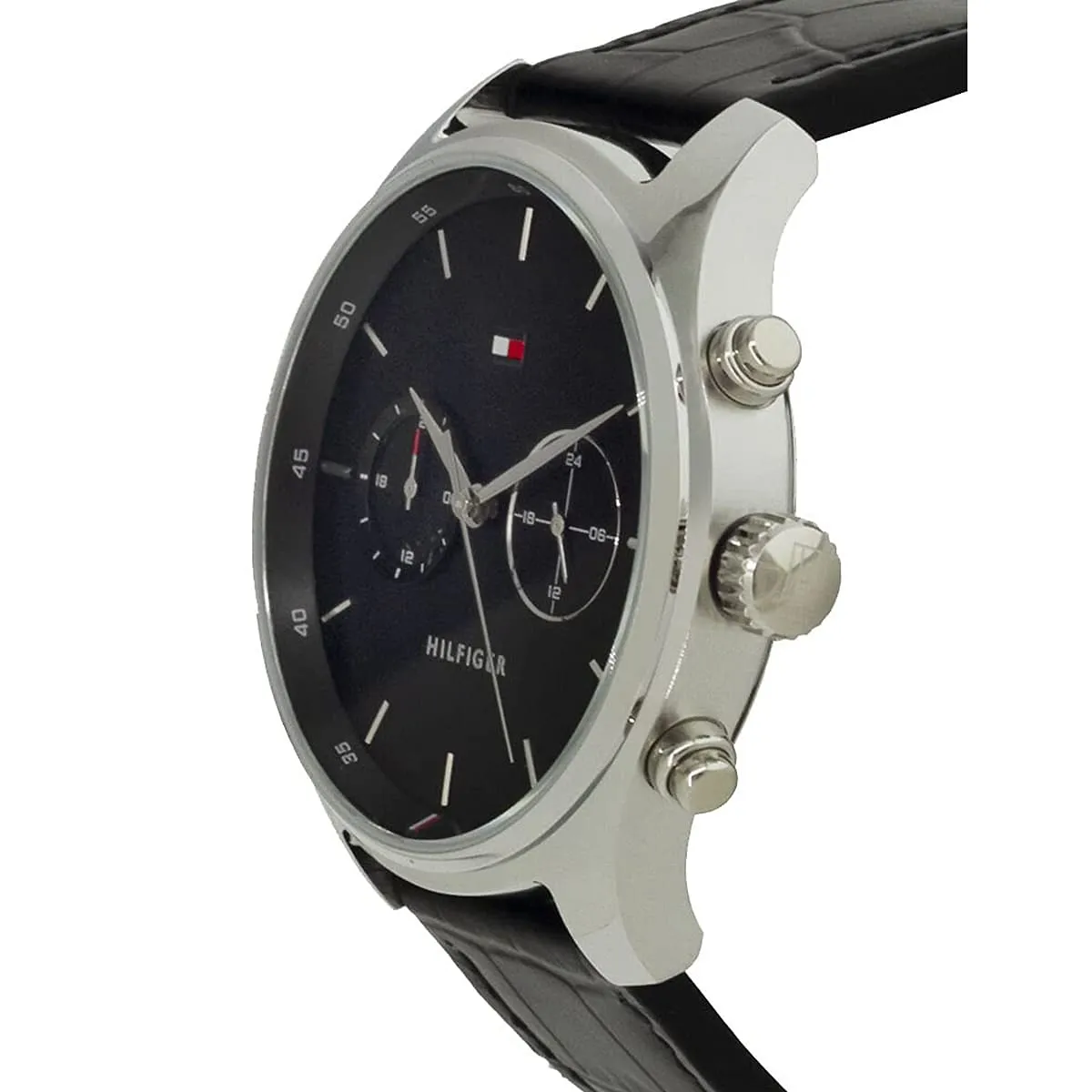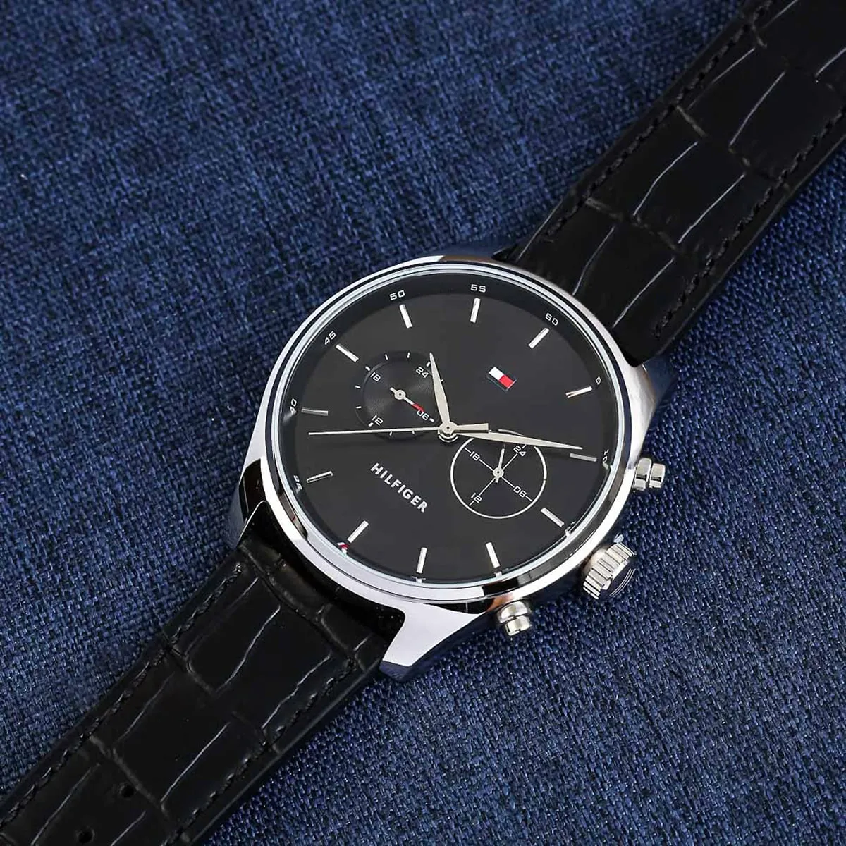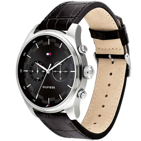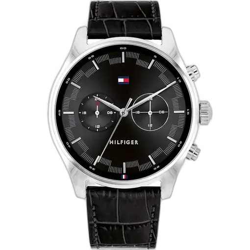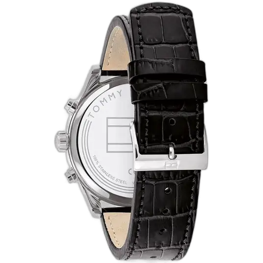 The strap of the Tommy Hilfiger Sawyer Watch 1710424 is its key element for comfort and contrasting style. It is a soft, yet durable Black Genuine Leather Strap finished in a uniform Black color. The leather material offers a sophisticated texture and conforms comfortably to the wrist over time, ensuring a custom fit. The strap secures with a classic buckle clasp. For practical daily assurance, the watch maintains a rating of 50 Meters (5 ATM) of water resistance, offering appropriate protection against moisture, accidental splashes, and light rain. The powerful combination of the bold black dial and the sleek leather strap makes the Tommy Hilfiger 1710424 Watch an instantly appealing symbol of refined, casual luxury.