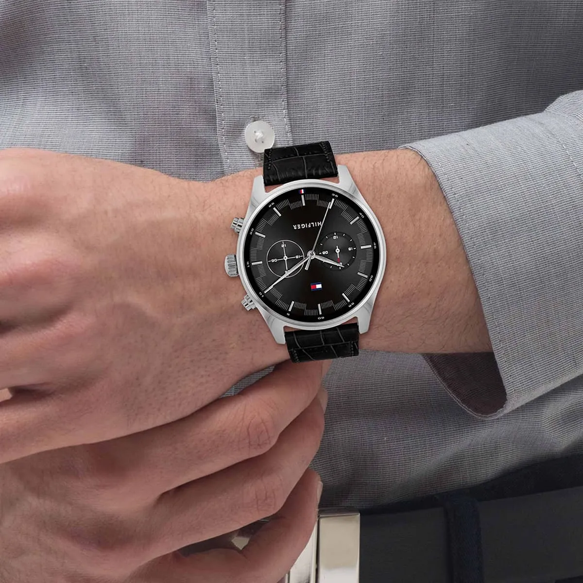 The Tommy Hilfiger Sawyer Watch 1710424 is a definitive expression of bold, modern American style, perfectly capturing the brand’s commitment to sophistication and edge. This model is exceptionally desirable for its dramatic monochromatic All-Black design, featuring a deep Black Dial set within a robust Black-Tone Stainless Steel Case, and paired with a comfortable Black Genuine Leather Strap. The Tommy Hilfiger 1710424 Watch is an Edgy and Bold timepiece, meticulously designed for the modern man who values straightforward functionality and a high-impact, sleek aesthetic. It serves as an essential daily accessory, offering versatility that works equally well with formal business attire or sophisticated casual outfits.