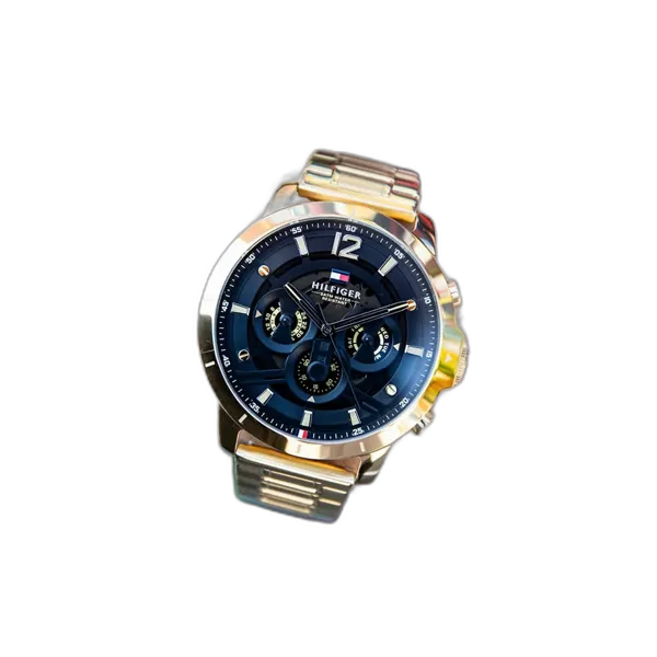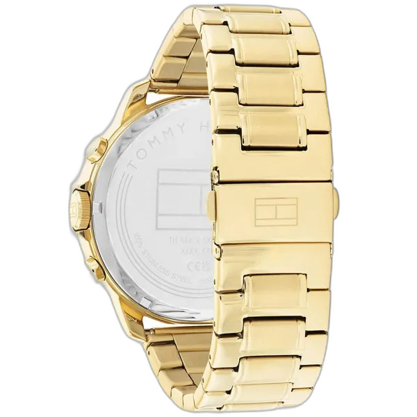 Step into the world of iconic American fashion with the Tommy Hilfiger watch, a perfect blend of classic elegance and modern sophistication. Renowned for its high-quality craftsmanship and distinctive designs, Tommy Hilfiger delivers with this authentic watch, reference 1710511, also known as the Luca model (Factory number TH.458.1.34.330986). Featuring a refined black dial and a luxurious gold-tone stainless steel bracelet, this timepiece offers a bold and versatile look, ideal for the modern man who values style and functionality. Its water resistance up to 50 meters ensures it can handle everyday activities, including light swimming, though not recommended for deep diving or high-impact water sports. The watch features a chronograph quartz movement with three sub-dials, a date window, and a 24-hour indicator, adding practicality and elegance to its dynamic design, making it a perfect companion for both professional and casual settings.
